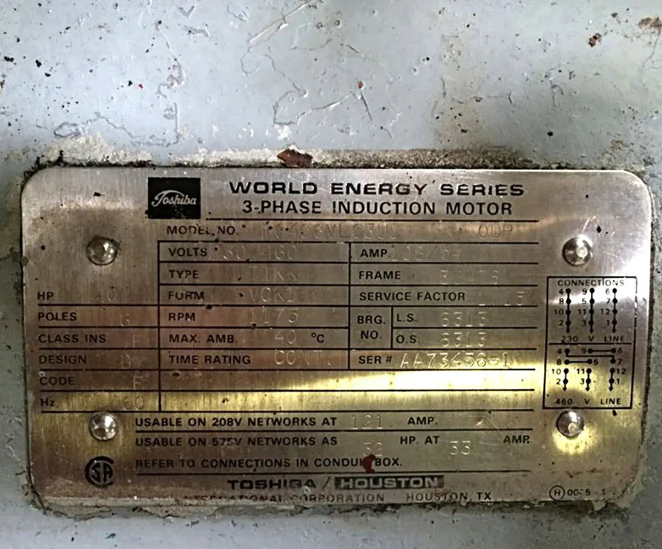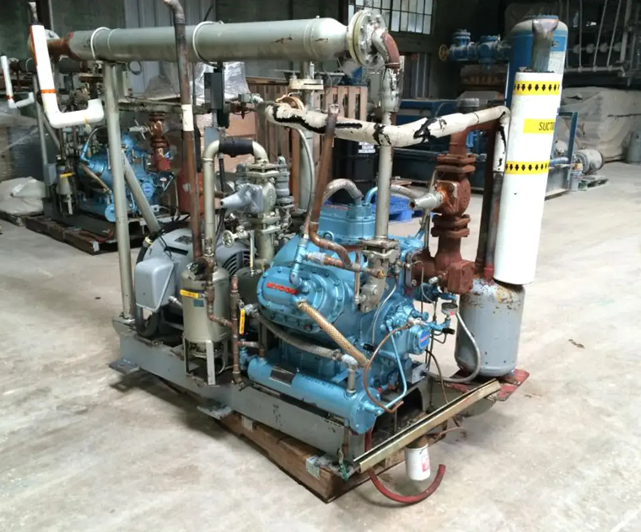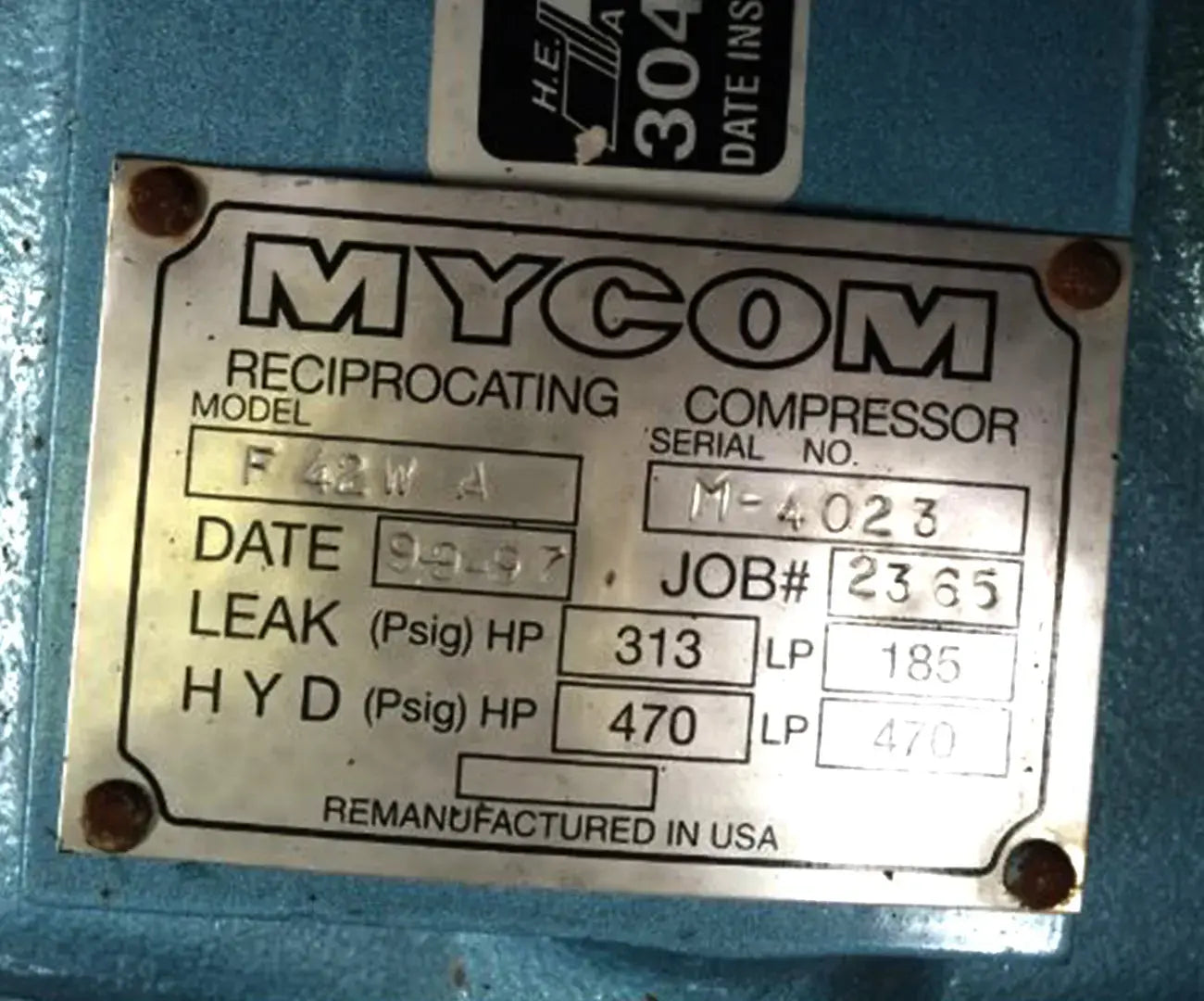 Mycom Reciprocating Compressor. Model: F42WA. Serial: M-4023. Job: 2365. Date: 9-9-97. Remanufactured in USA. Toshiba motor: 40 HP, 1175 RPM, 208-230/460V, 121-108/54 amps, 3-phase, 60 Hz, 364TS Frame. Ratings for Mycom W-series model F4WA2: 91.2 CFM displacement, 30.3 TR at +20F / +95F, 9.7 TR at -20F / +95F.