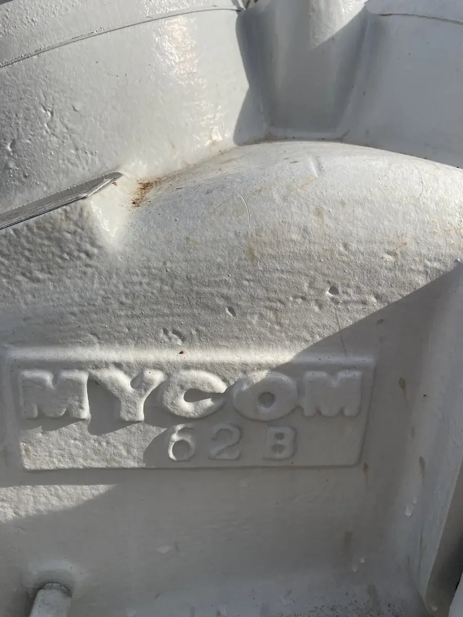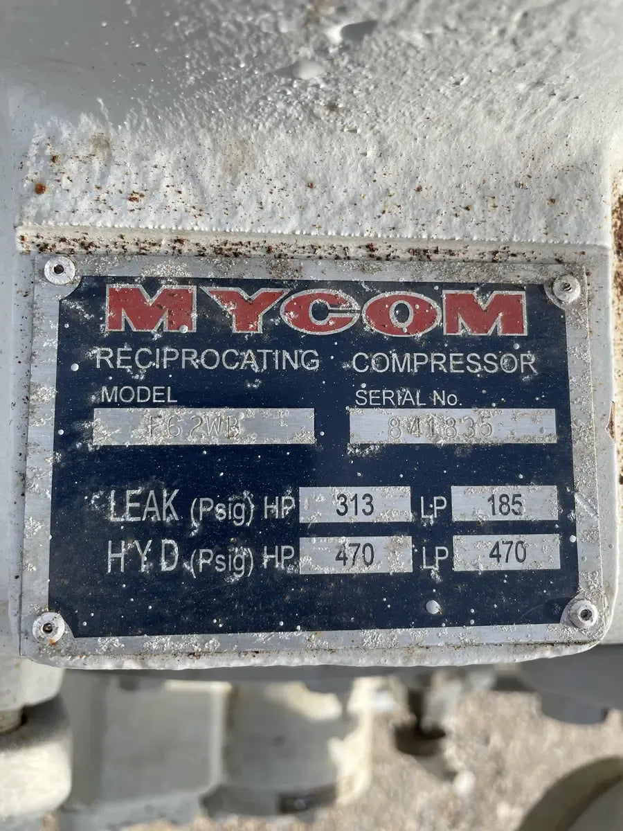 Mycom F62WB 8-Cylinder Bare Reciprocating Compressor - Model: F62WB, Serial No: 841835, Leak Test Pressure (psig): HP 312 LP 185, Hydrostatic Test Pressure (psig): HP 470 LP 470. Numbers of Cylinders - Low Stage: 6, High-Stage: 2. Bore x Stroke(mm) - 130x 100, Number of Revolutions - 800 to 1200. Total of Cylinders: 8. Toshiba High Efficiency Motor - Hp: 100, Model No: B1004VLF3UM, Encl: DP, Type: TIKK, Form: VBK1, Fr: 404T, Duty: CONT, Max AMB: 40, Volts: 230/240, Hz: 60, RPM: 1770, AMP: 248/124, Serial No: 91703235.
