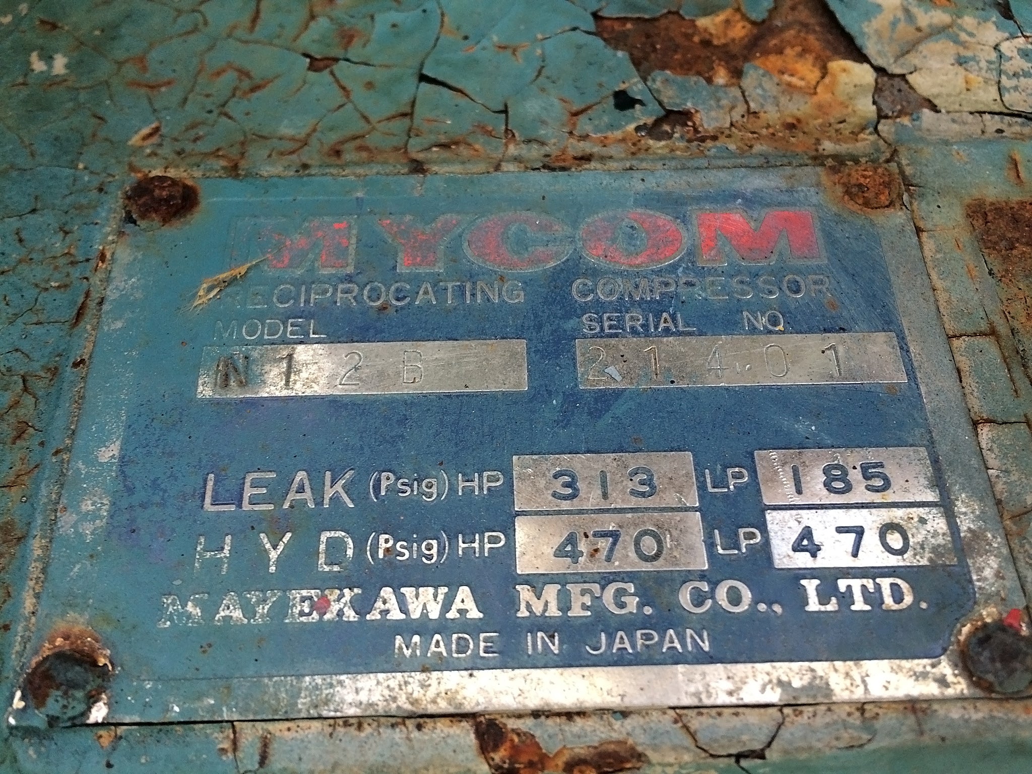 Mycom 12-Cylinder Reciprocating Compressor – 250 HP. Model: N12B. Serial: 21401. Made in Japan. Toshiba motor: 250 HP, 1180 RPM, 460V, 60 Hz, 3-phase, 505UZ Frame.