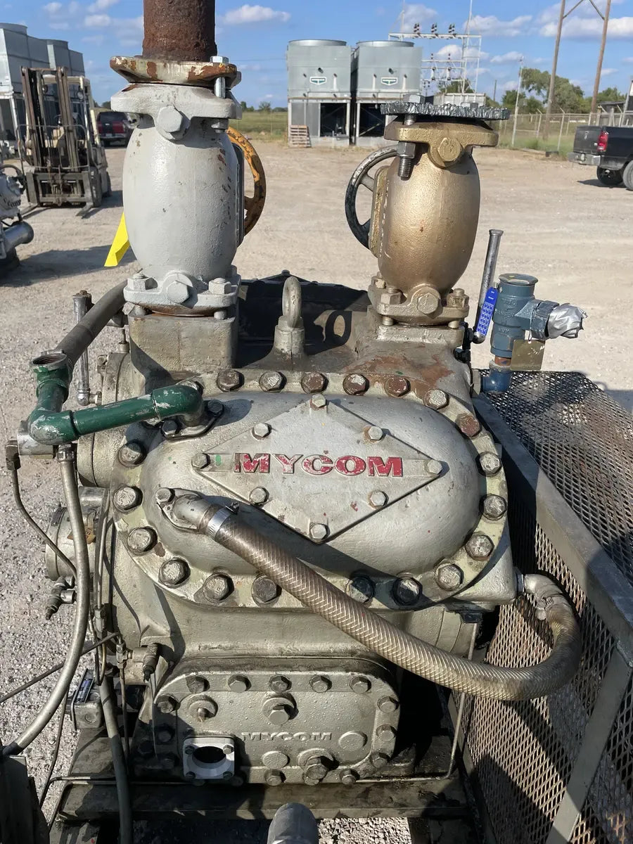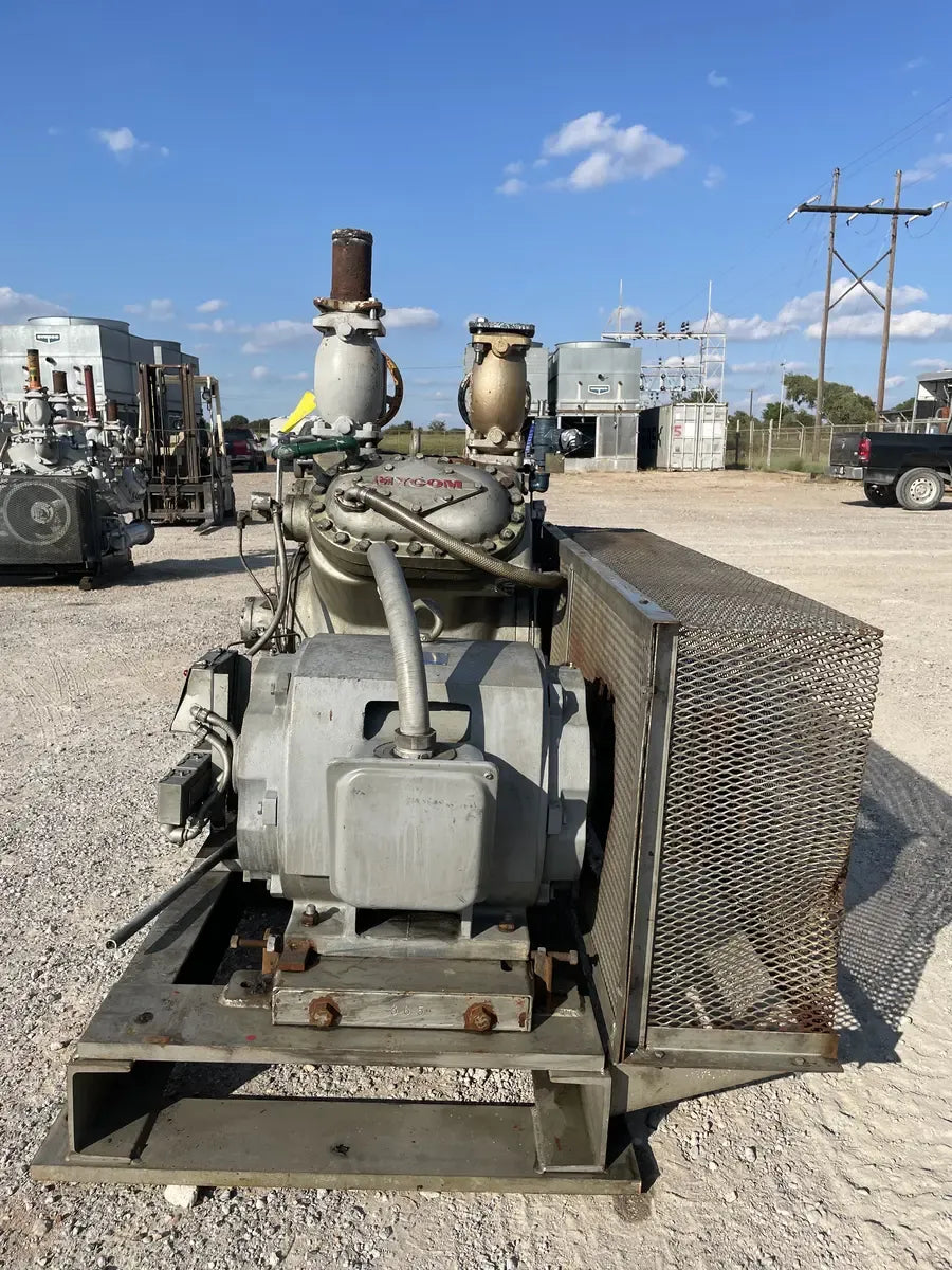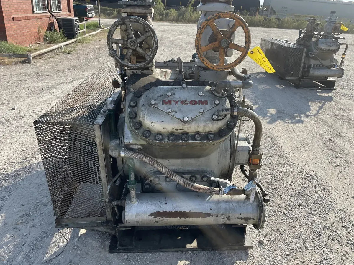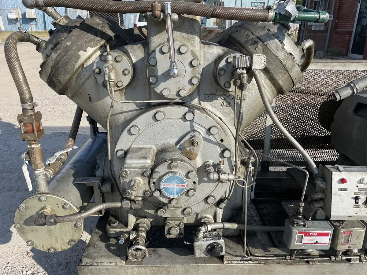 Mycom 4-Cylinder Reciprocating Compressor. Model: N4B, Serial No: 10942, Leak Test Pressure (PSIG) 313 HP/185 LP, Hydrostatic Test Pressure (PSIG) 470 HP/470 LP. Teco Westing House Motor: Type: ASHE, Rating: Cont, HP: 75, Frame:365T, Poles: 4, Ins: F, Phase: 3, Hz: 60, Volts: 230/460, AMPS: 179/89.5, RPM: 1775, Design: B, AMB: 40c, Nema Nom EFF: 95.0, Bearings: 6314, Serial No: JJ7897180015, Usable On 208 Volts Network @ 198 AMP.