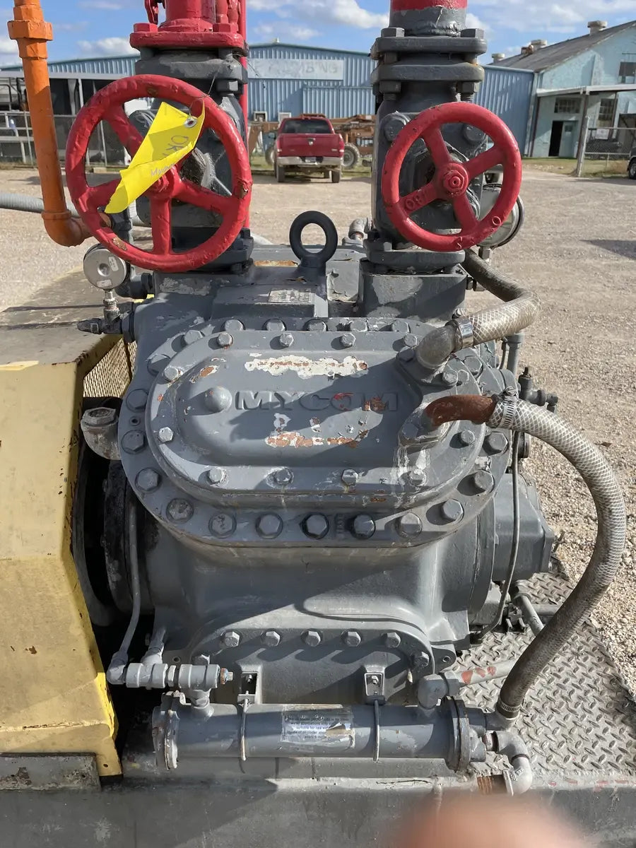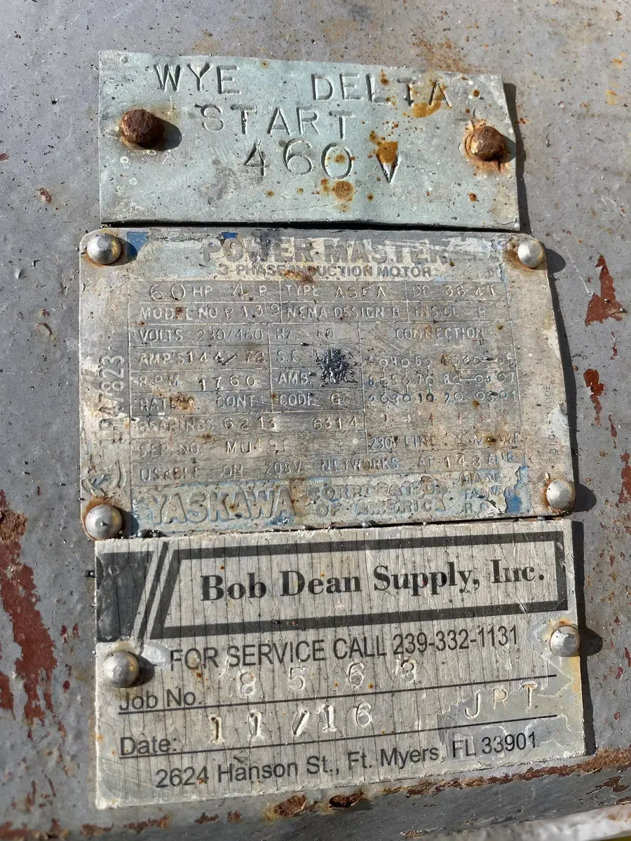 Mycom 4-Cylinder Reciprocating Compressor. Model: N4WB, Serial No: 431628.,Leak (PSIG): 313 HP/185 LP, HYD (PSIG): 470 HP/470 LP. Number of Cylinders: 4, Bore x Stroke(mm): 130x100, Number of Revolutions: 800 to 1200. Yaskawa Induction Motor: 60 HP, Type: ASFA, DP: 364T, Model No: P139, NEMA Design B, Ins Cl: B, Volts: 230/460, Hz: 60, AMPS: 144/72, S.F: 1.15, RPM: 1760, AMB: 40c, Rating: Cont, Code: G, Bearings: 621, Serial No: MU9650, Usable on 208V Networks at 143 AWP.