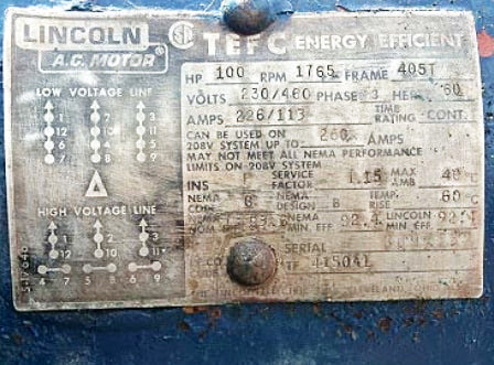 Mycom Reciprocating Compressor. Model: N6BM. Serial: 16863. Mayekawa Mfg. Co., LTD. Made in Japan. Leak (PSIG): HP 313, LP 185. HYD (PSIG): HP 470, LP 470. Lincoln TEFC Electric Motor: 100 HP, 1765 RPM, 405T Frame, 208-230/460V, 260-226/113 amps, 3-phase, 60 Hz. Lincoln Electric Co. Cleveland Ohio. Estimated weight: 4,500 lbs. Overall dimensions: 94 in. L x 52 in. W x 66 in. High.