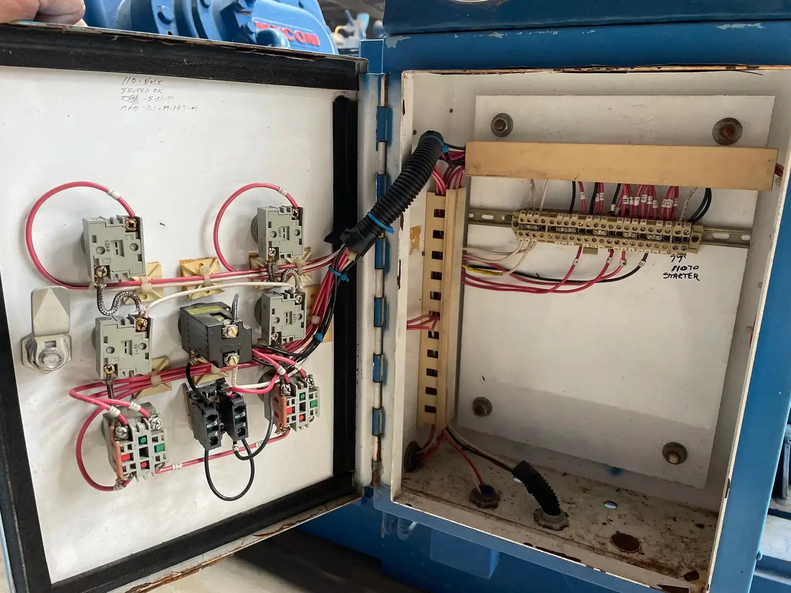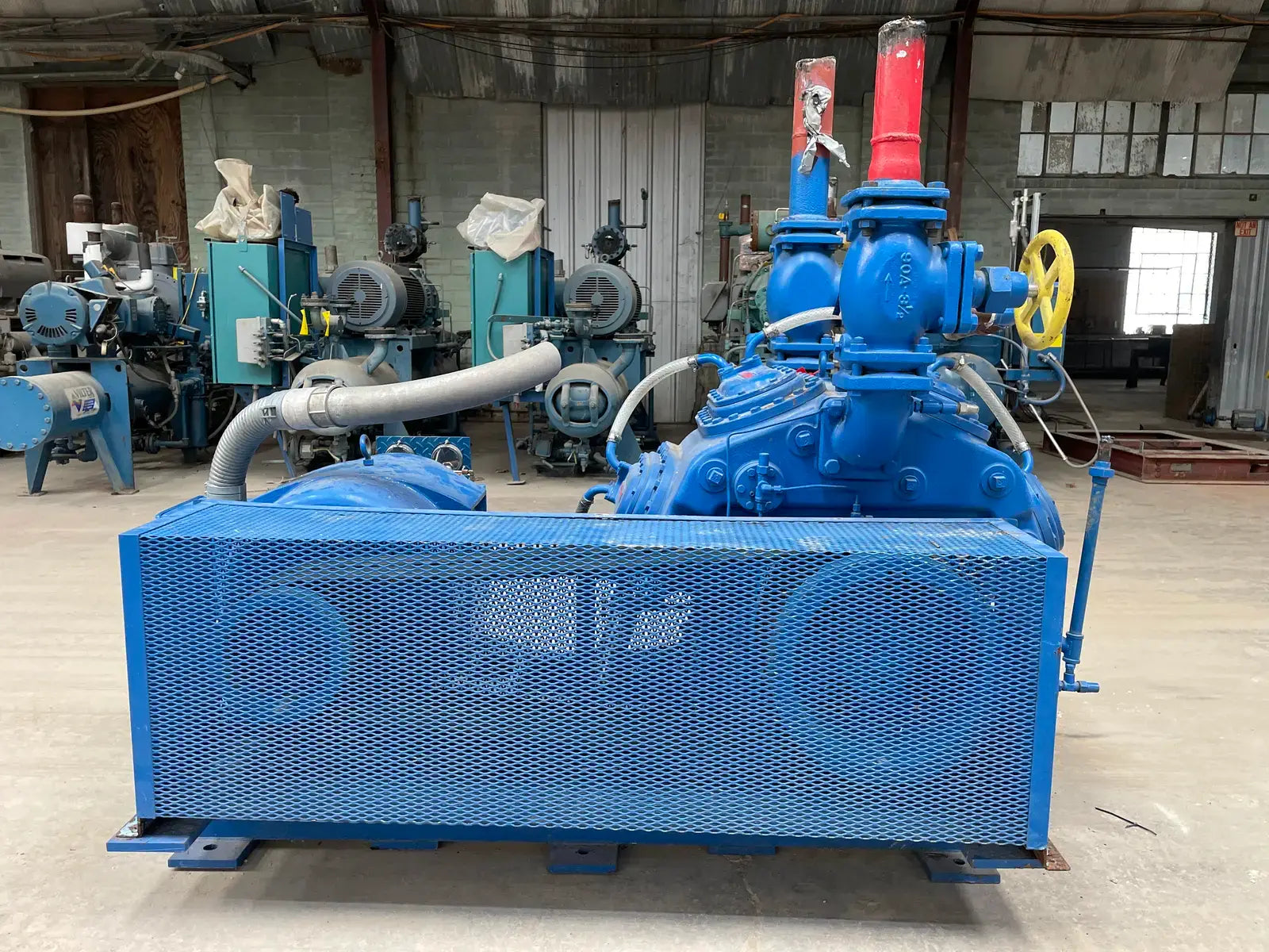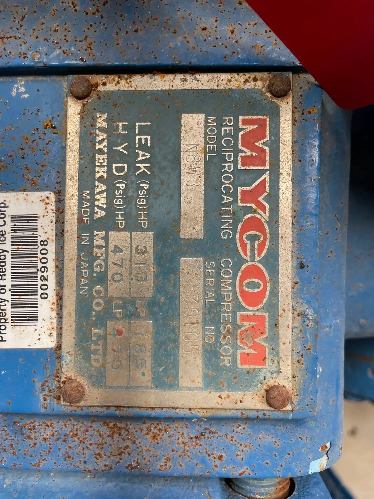 Mycom Belt-Driven Reciprocating Compressor Package. Model: N8WB. Serial No: 830105. Number of Cylinders: 8. Max RPM: 1200. Displacement at Max Speed: 450 CFM. Connections - Suction: 4 in. Discharge: 3 1/2 in. Marathon Electric Motor: HP: 150, Volts: 460, RPM: 1780, Hz: 60, Amps: 179, Frame: 444T.