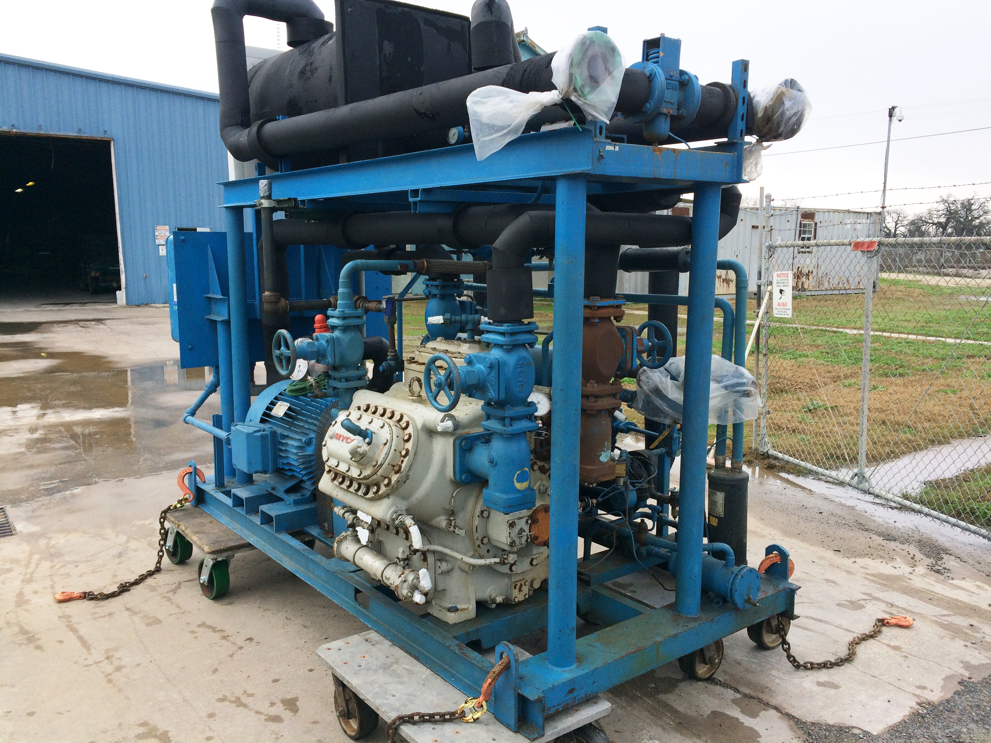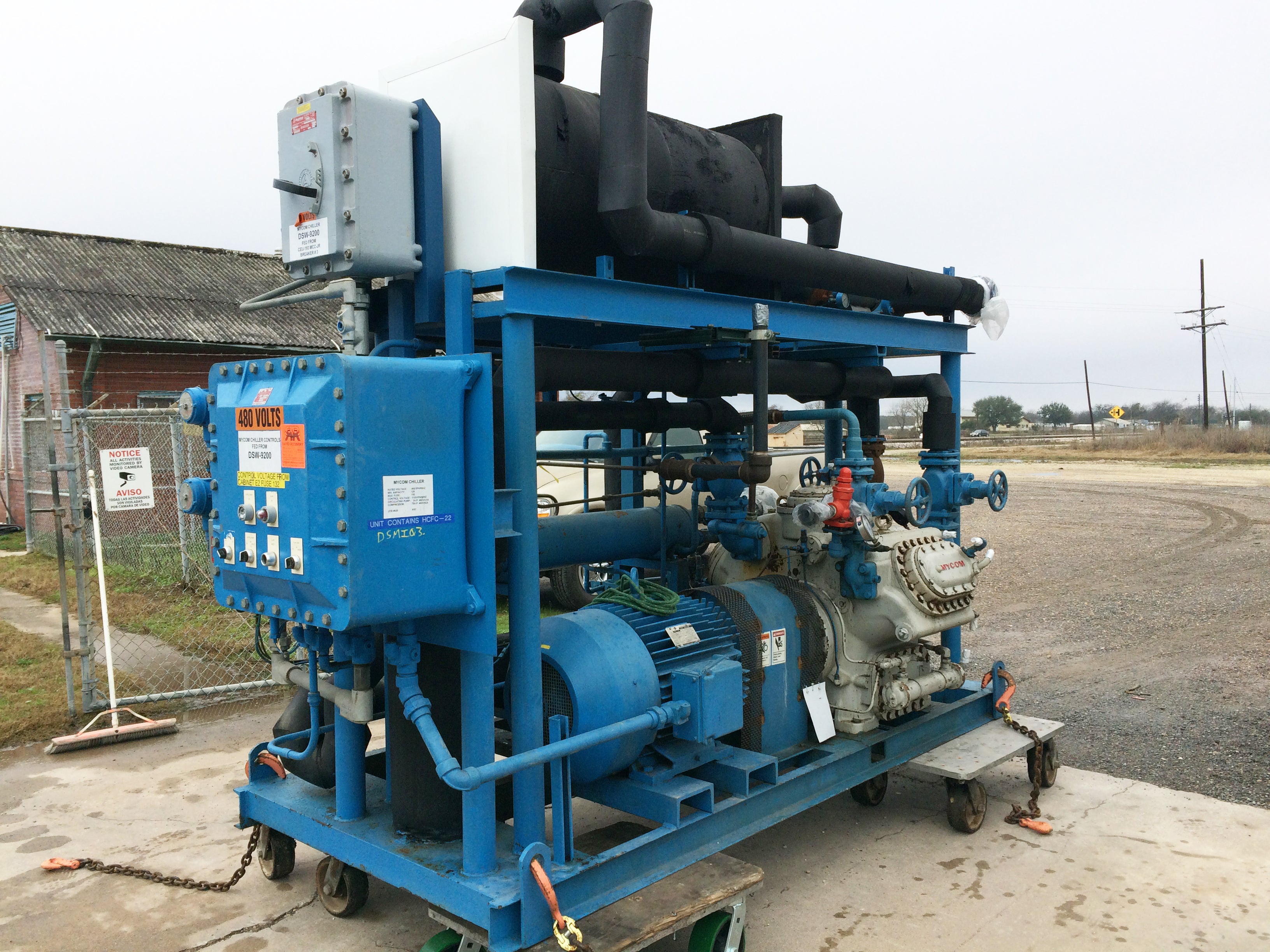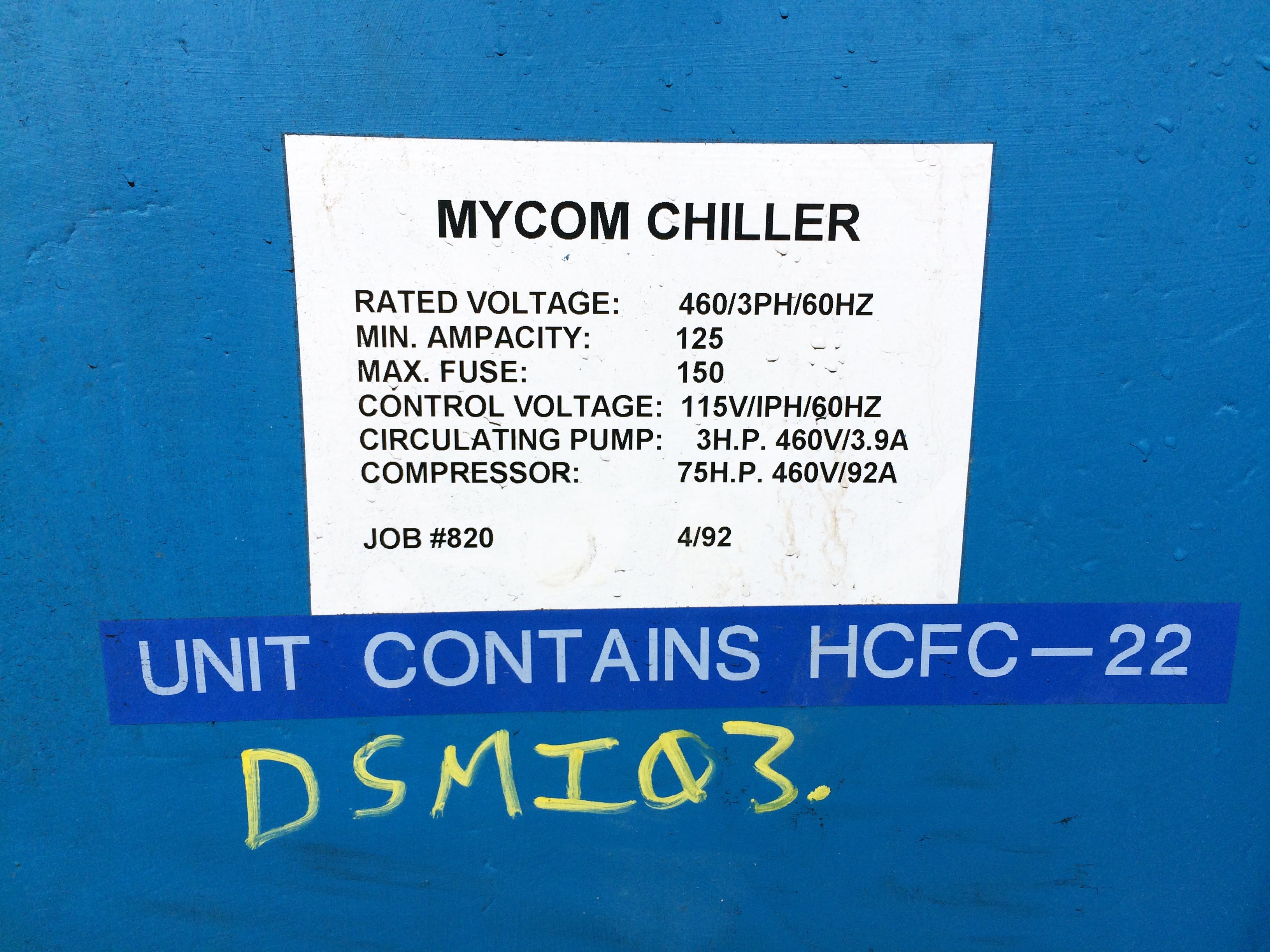 Mycom Indoor Chiller Skid – 15 TR. Refrigerant: R-22. Mycom 2-stage 6-cylinder reciprocating compressor: model F42WB, serial 640483, 75 HP, 460V, 3-phase, 60 Hz. Circulating pump: 3 HP, 460V, 3-phase, 60 Hz. NuTemp, Inc. job no.: 820. Features compressor, intercooler, water cooled condenser, and evaporator chiller barrel. Date: 4/92. Estimated weight: 15,500 lbs. Dimensions: 13 ft. 1 in. L x 6 ft. 1 in. W x 8ft. 10 in. H.