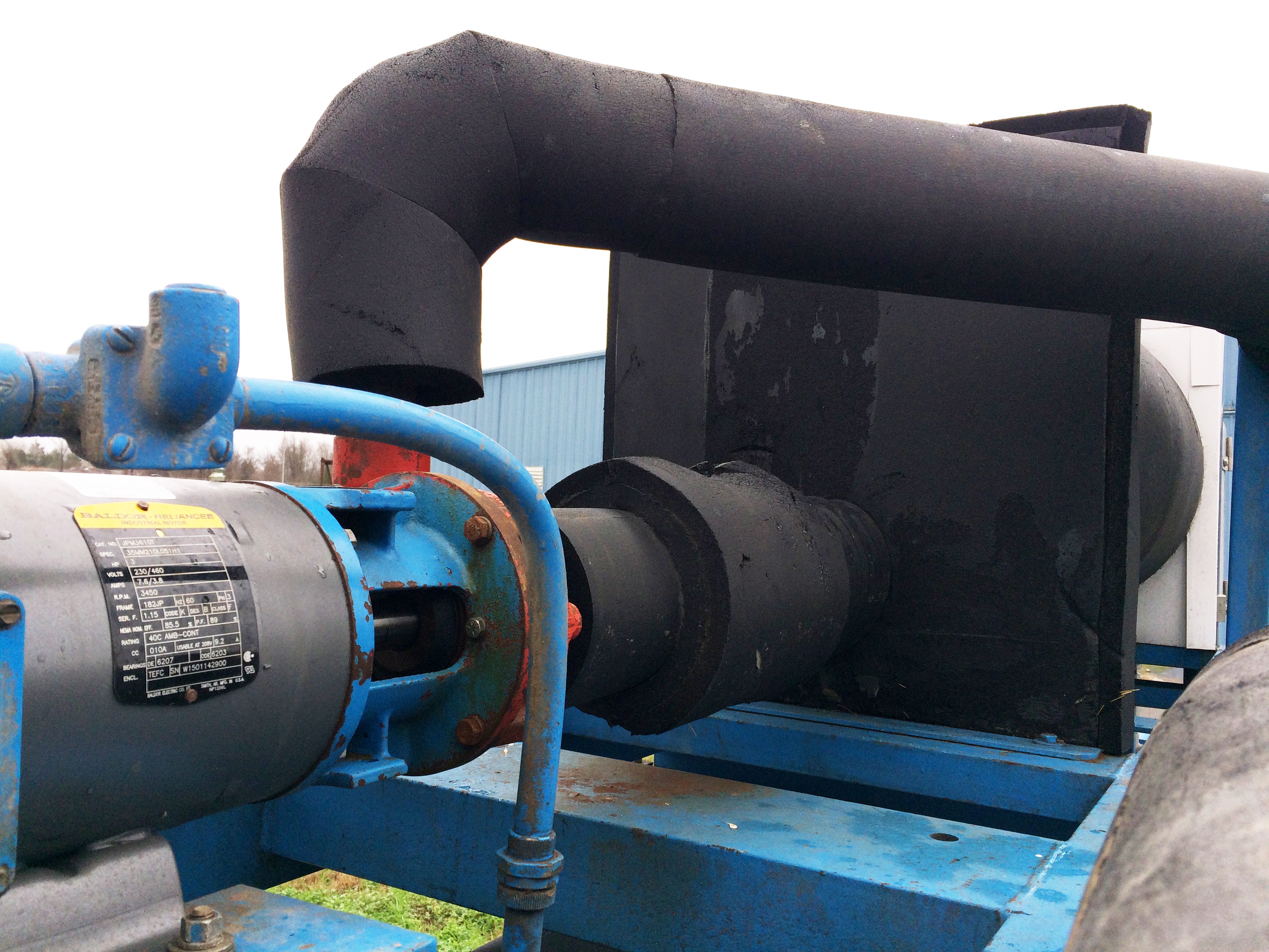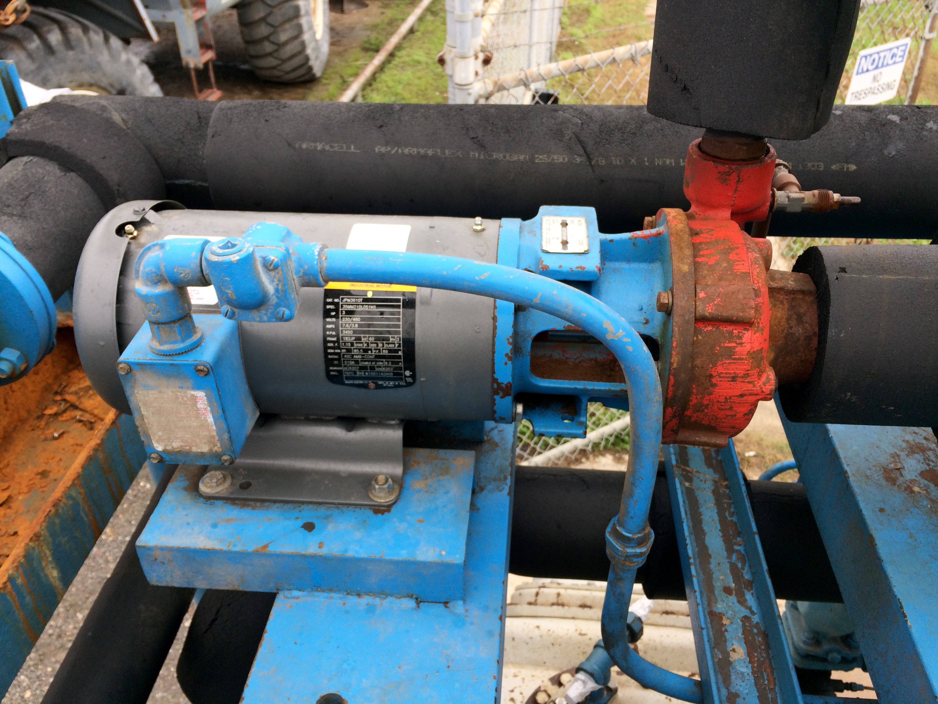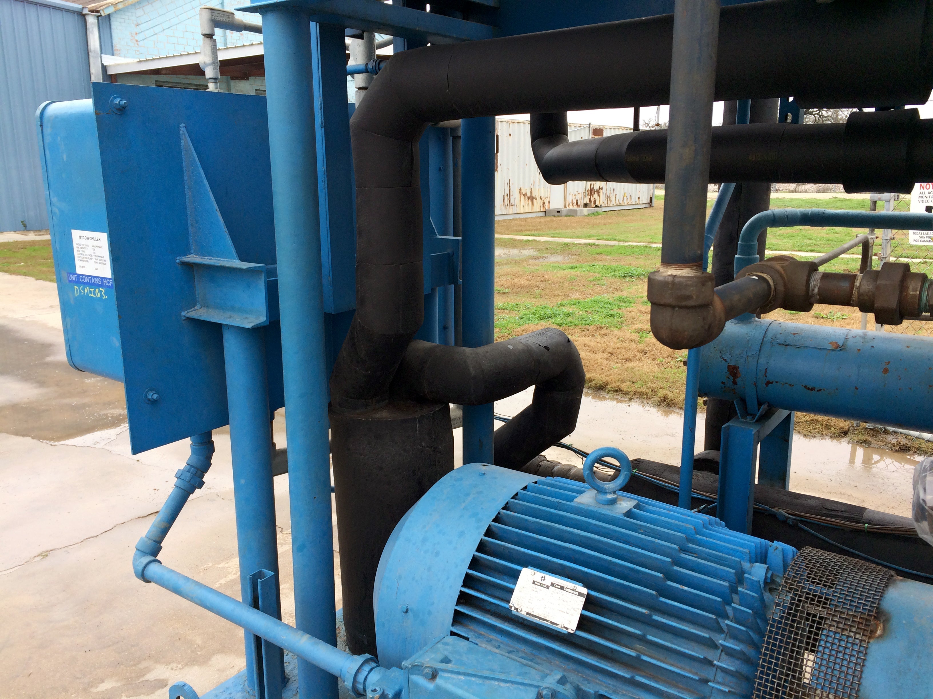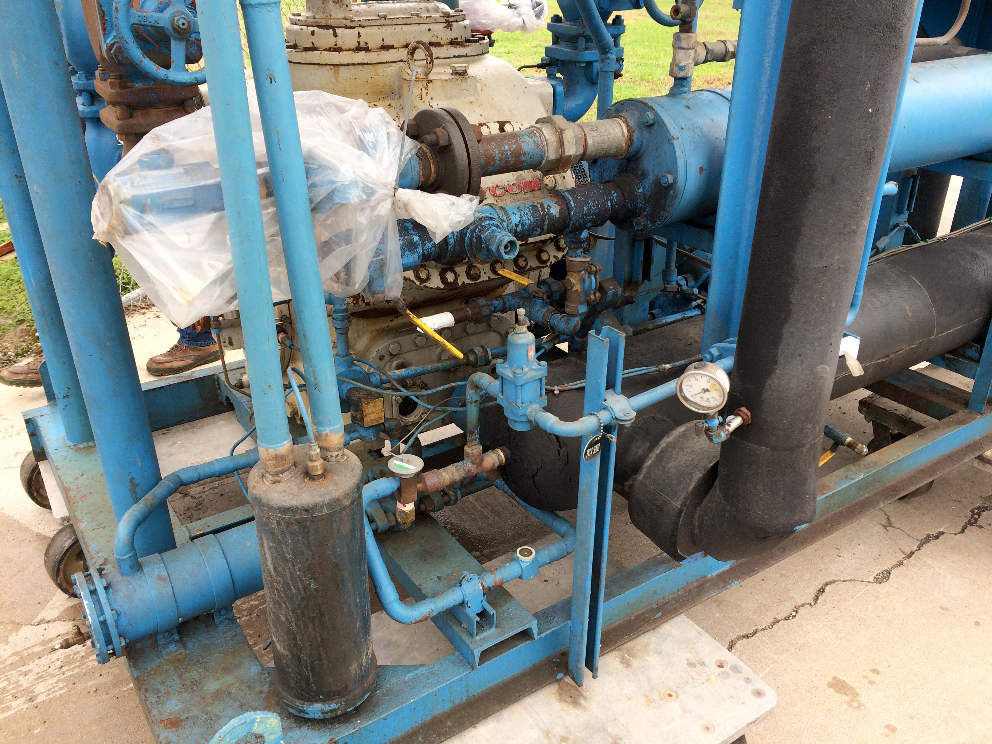 Mycom Indoor Chiller Skid – 15 TR. Refrigerant: R-22. Mycom 2-stage 6-cylinder reciprocating compressor: model F42WB, serial 640483, 75 HP, 460V, 3-phase, 60 Hz. Circulating pump: 3 HP, 460V, 3-phase, 60 Hz. NuTemp, Inc. job no.: 820. Features compressor, intercooler, water cooled condenser, and evaporator chiller barrel. Date: 4/92. Estimated weight: 15,500 lbs. Dimensions: 13 ft. 1 in. L x 6 ft. 1 in. W x 8ft. 10 in. H.