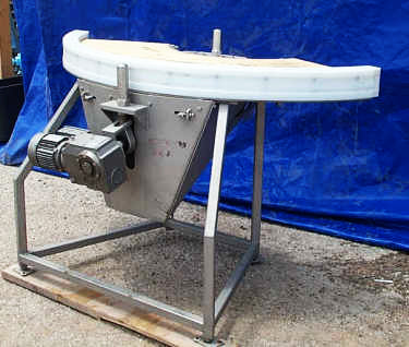 Neoprene 135 degree turn conveyor, overall 42 inch height x 64 inch length x 42 inch width, belt 17 inch width with 73 inch outer circum 35 inch inner circum, legs 34 inch height to base, Sew-Eurodrive motor type DFT71D4-K8 0.5hp 1700rpm, 565 torque.(H17).