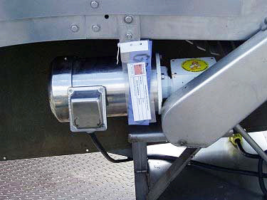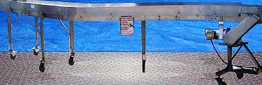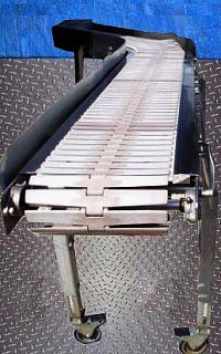 Nercon Tabletop Transfer Conveyor. Wash-down duty with stainless steel construction. Belt dimensions: 12 in. W x 16 ft. L. Maximum aperture: 18 in. x 16 ft. L. Height at conveyor inlet/outlet: 40 in. Baldor Wash Guard Motor, 1.0/0.75 hp, 1740/1440 rpm, 208/230/190 V, 1.5/1.4-3.4/3.2 FLA, 60/50 Hz, 3 ph. Iron Man Motor Drive, 20 ratio, 87/72 rpm (final), 349 in-lbs torque. Overall dimensions: 16 ft. 3 in. L x 43 in. W x 41-1/2 in. H.