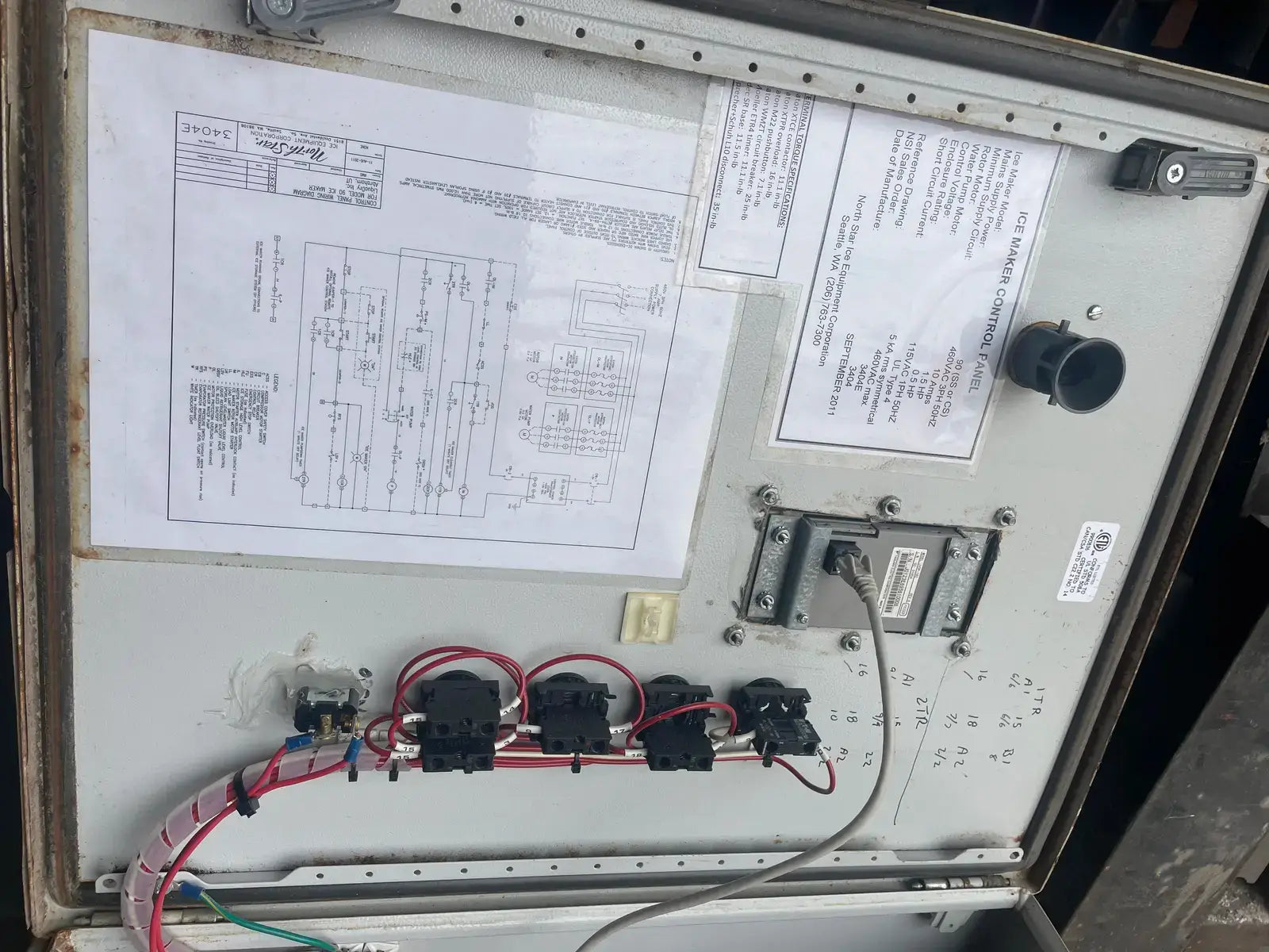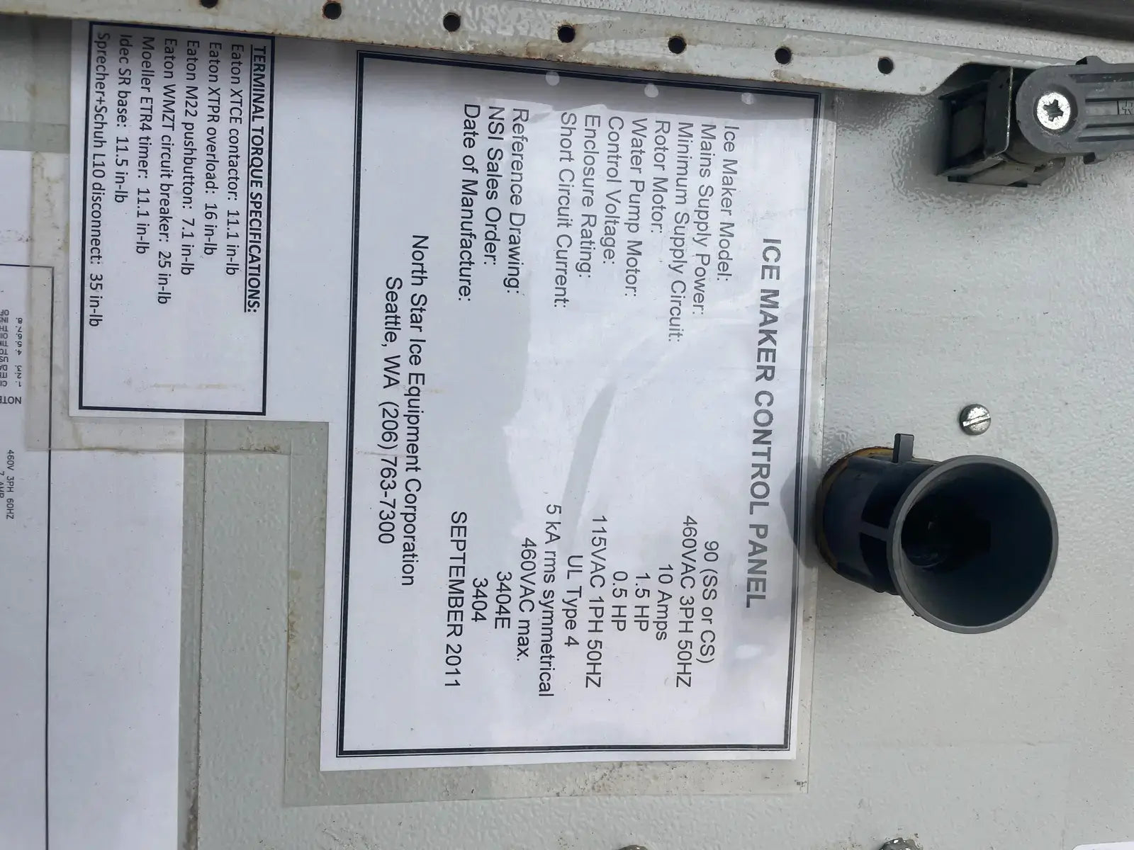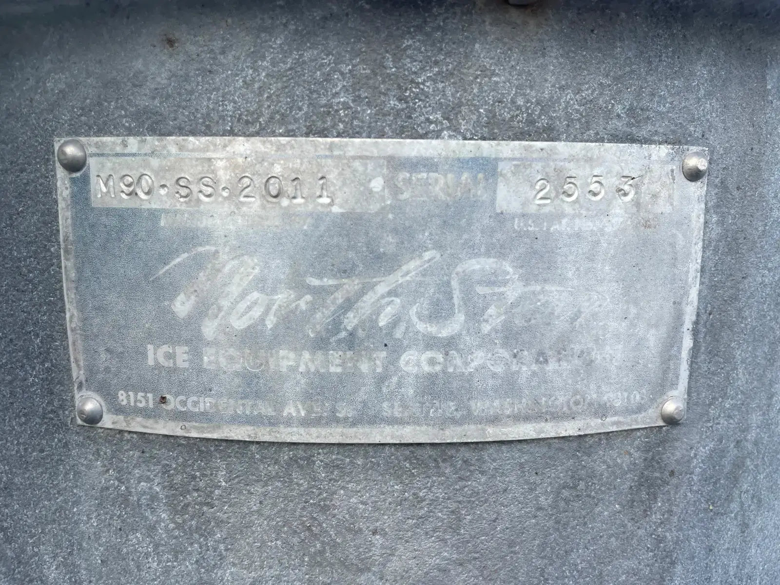 Northstar Stainless Steel Ice Maker. Model: M90-SS-2011. Serial No: 2553. Year of Manufacture: 2011. Tons Per Day: 40 TR. Drive Motor: 1 1/2 HP. Suction Line: 6 in. Liquid Line: 2 in. Volume: 645 ft3.