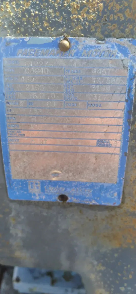 Pacemaker 6192760-F-4 Motor (150 HP, 1185 RPM, 460 V)  Serial Number: . 150 HP. Motor RPM: 1185. Motor Voltage:1185. Motor Voltage: 460. Motor Amps: 181. Motor Hertz (HZ): 60. Motor Phases: 3. Motor Frame Size: 445T. Shipping Dimensions (Inches): 41x42x28. Weight(lbs): 1564