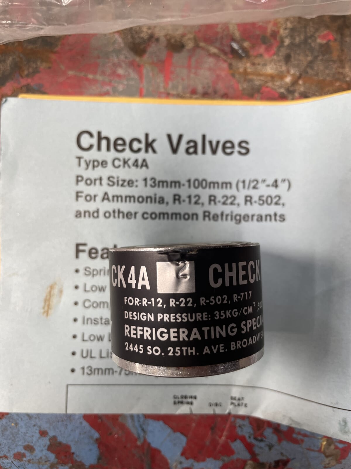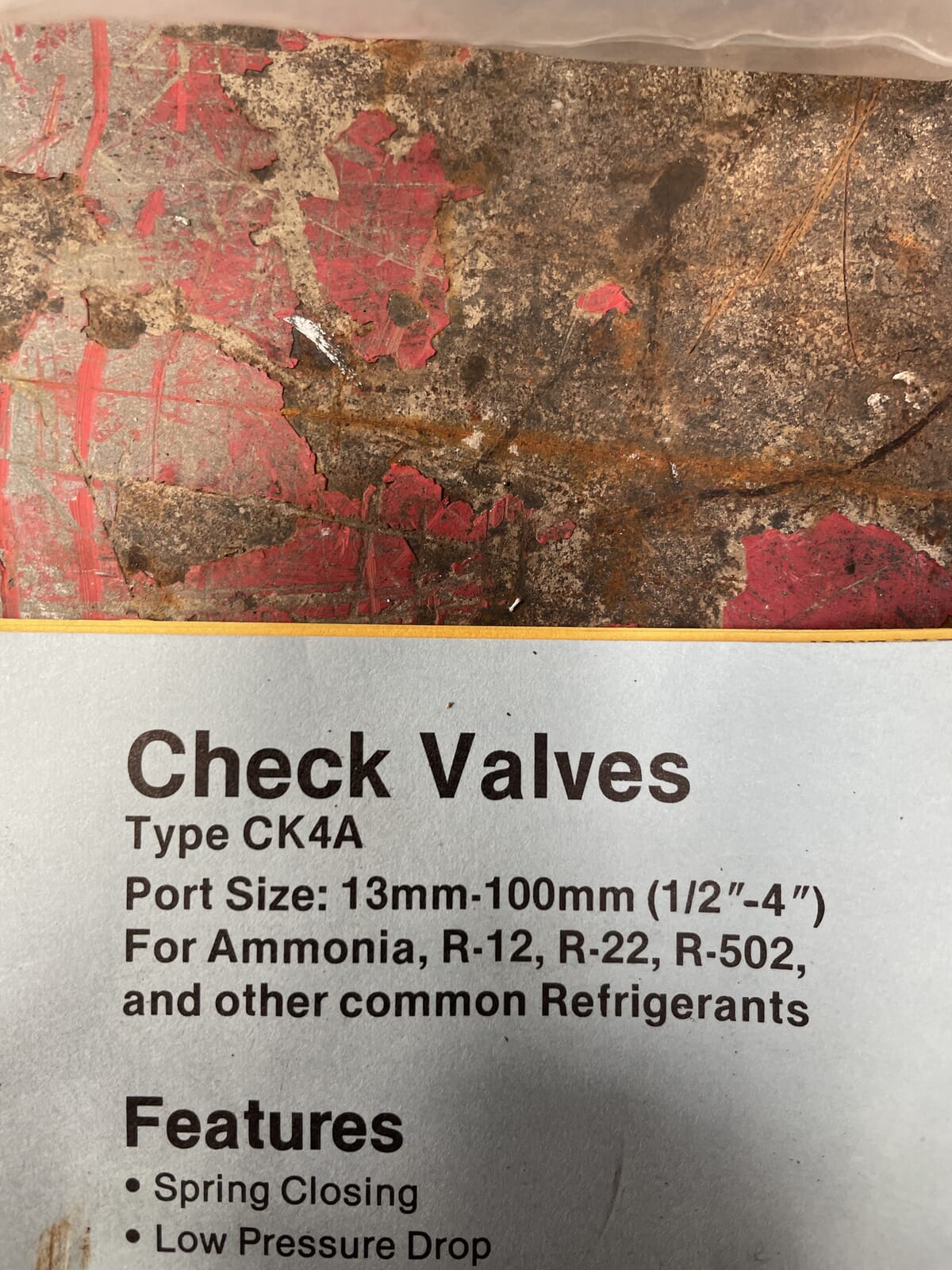 (4) Parker unused CK4A-2 Check Valves. Size: 13mm( 1/2). Common for Ammonia and other refrigerants.