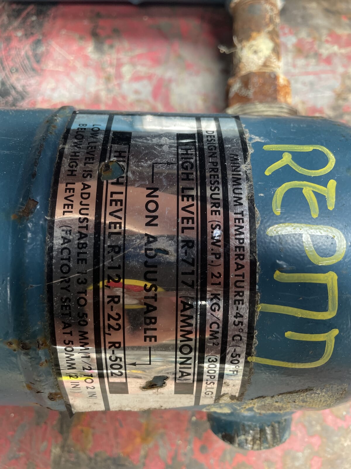 Parker LLSS refrigerant liquid level float switch. Design pressure: 300 PSIG. Minimum temperature: -45 C (-50 F). The low level is adjustable from 13 to 50 mm(1/2 to 2 in). Below the high level (factory set at 50mm(2 in).