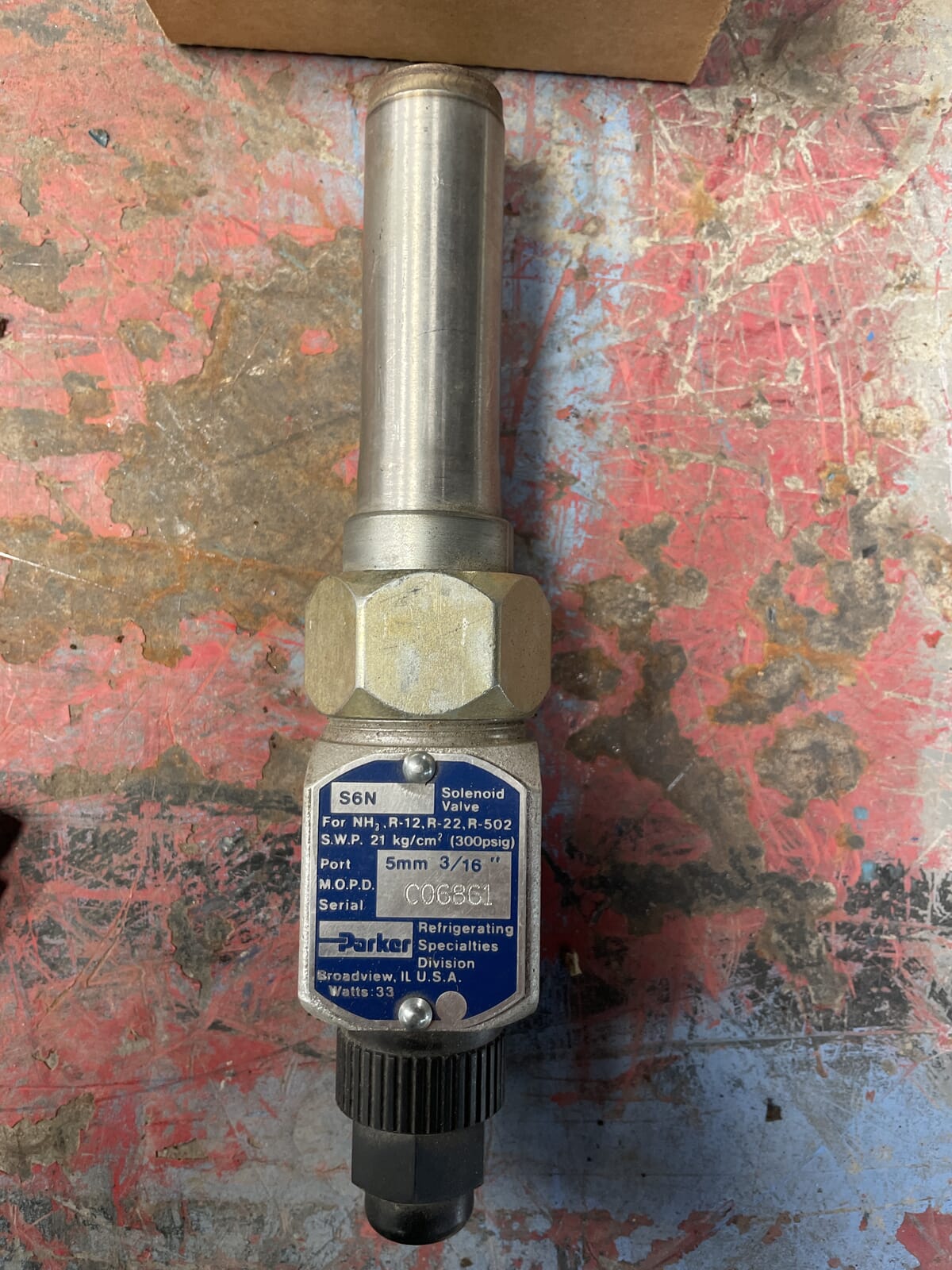 Unused Parker S6N Solenoid Valve. Port size: 5mm (3/16). Used for ammonia, R12, R22, R502, and other common refrigerants. A solenoid valve is an electrically operated device used to control the flow of liquids or gases in a fully open or fully closed configuration.