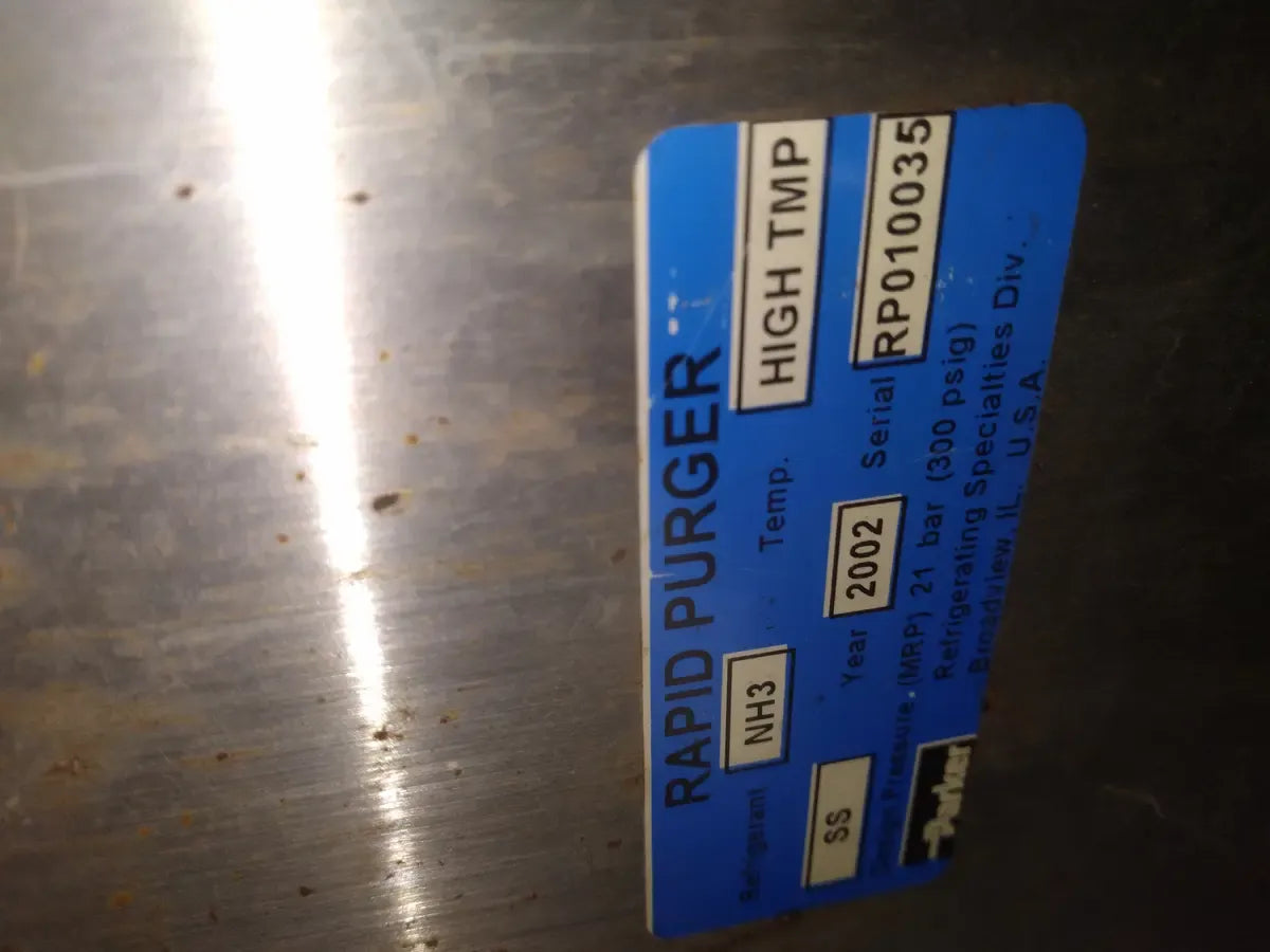 Rapid SS Refrigerant Purger. Previous Refrigerant: NH3. Temp: High Temp, Mfg Date: 2002, Serial No: RP010035, Design Pressure (MRP) 21 Bar (300 PSIG).