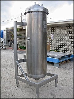 Paul Mueller Company Stainless Steel Pressure Vessel. MAWP 160 psi at 212°F. Approximate capacity: 150 gallons. Inside dimensions: 26 in. dia. x 68 in. straight wall. Inlets/Outlets: (1) 1 in. s-line. (1) 1 in. FNPT. (3) 1-1/2 in. s-line. (3) 2 in. s-line. (1) 4 in. s-line. Overall dimensions: 3 ft. 1 in. L. x 2 ft. 11-3/4 in. W. x 8 ft. 2 in. H.