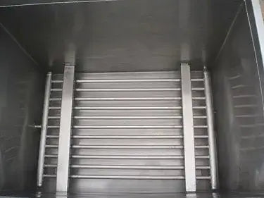 Paul Mueller Jacketed Cook/Cool Tank- 500 Gallon. Inside straight-wall dimensions: 5 ft. 1 in. L x 3 ft. 6-1/2 in. W x 3 ft. 9 in. H. Number of heat/cool tubes: 11. Tube dimensions: 1-1/4 in. dia. x 3 ft. 6-1/2 in. L. Tube volume: 2.5 gal. Inlets: (2) 1 in. dia. ports (jacket), (1) 5 ft. 1 in. L x 3 ft. 6-1/2 in. W product infeed. Outlets: (1) 2 in. dia. S-line drain port, (1) 1/2 in. dia. port, (3) 1 in. dia. ports (jacket), (1) 1 in. dia. FNPT fitting. Overall dimensions: 5 ft. 8 in. L x 4 ft. 6 in. W x 4 ft. 5 in. H.