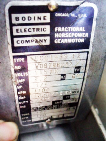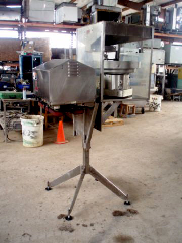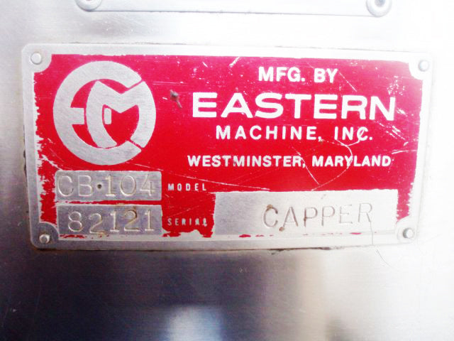Pearl Packaging / Eastern Machine Bottle Capper with Vibratory Feeder. Model: CB104. S/N: 82121. Nominal capacity: 180 caps per minute. Maximum cap size: 60mm. Motors: 0.5 hp, 90 V DC. Hopper. Model: CH100, S/N: 9212. 29 in. L x 25 in. W x 9 in. H. Feeder: 21 in. dia., 115 V, Model: 120. S/N: CCW. Multi-Drive DC motor control: 120 V for rollers-belts-caps. Bottle grip lane: 31 in. L x 2-1/2 in. W (adjustable). Overall dimensions: 3 ft. 4in. L x 4 ft. W x 7ft. H.(ACN26-82).