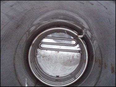 2002 Permian Fabrication & Service Vertical Stainless Steel Heated Tank. Approximate capacity: 1000 gallons. Shell thickness: 10 gauge. Head thickness: 10 gauge. Inside straight wall dimensions: 4 ft. 6 in. Dia. x 9 ft. L. Number of coil rows: 7. Coil size: 2 in. Inlets: (2) 2 in. dia. ports, (1) 3/4 in. dia. port, (2) 1 in. dia. ports. Outlets: (1) 2 in. dia. port, (1) 1 in. dia. port, (1) 4 in. opening on top for shaft. Overall dimensions: 6 ft. L x 6 ft. W x 13 ft. 4 in.(HB1)(ACN350).