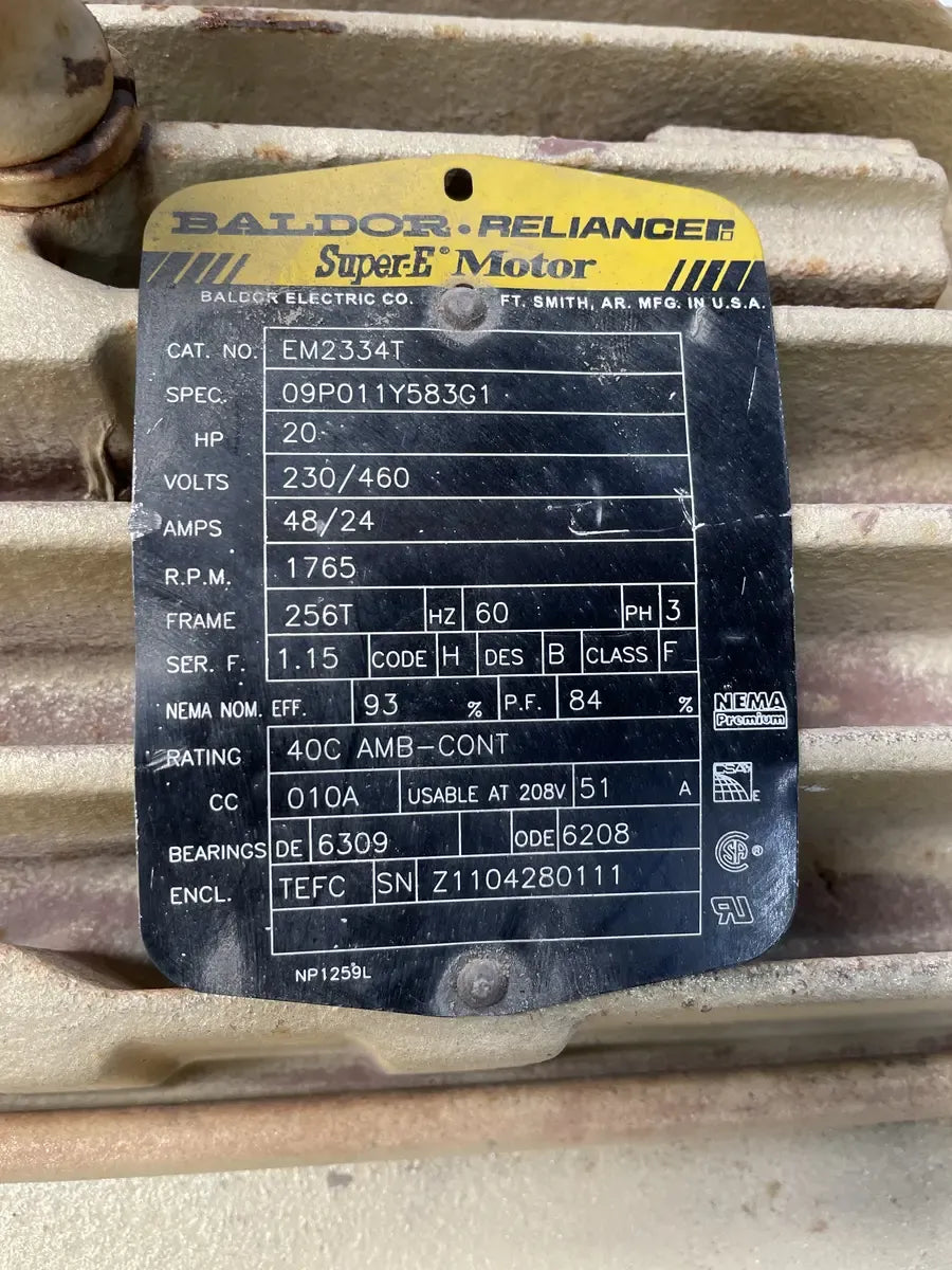 Tuthill Vacuum & Blower Systems: Model Number: 5003-A61 2CV1 A, Serial Number: 3435871610, MAWP: 15, Mfg: 2016, Baldor Reliance Electric Motor: Cat No: EM2334T, Spec: 09P011Y583G1, HP: 20, Volts: 230/460, Amps: 48/24, RPM: 1765, Frame: 256T, Hz: 60, Ph: 3, Ser. F: 1.15, Code: H, Des: B, Class: F. Nema Nom. EFF. 93%, P.F: 84%, Rating: 40c AMB-CONT, CC: 010A, Usable at 208v, 51 A, Bearings: DE:6309, ODE: 6208, ENCL: TEFC, Sn: Z1104280111