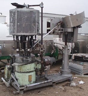 Pneumatic Scale Corporation Pneumacap-Series 8-head Capper. Model: Pneumacap 3338. S/N: 20030. Nominal capacity: 240 cpm. Maximum Container diameter: 4 in. (Cap Bowl diameter: 36 in. Cap size: 38mm x 12mm (1 ½ in. dia. x ½ in. H.) caps. Maximum bottle size: 3 in. dia. x 6 in. H. Pneumacap Rotating Cap Sorter. General Electric Motor, ¼ hp, 1725 rpm, 115/230 V, 5.0/2.5 amps, 60 Hz, single phase. Speed Selector Inc. Series 21 Fixed Center Drive, Model: 4C. Infeed/exit height: 3 ft. Overall dimensions: 8 ft. 7 in. L x 3 ft. 6 in. W x 7 ft. 7 in. H. (ACN1550). This piece is being offered and sold as is. It may or may not be complete. Please be sure and look at pictures and ask for additional pictures. Do not rely on original descriptions.