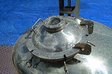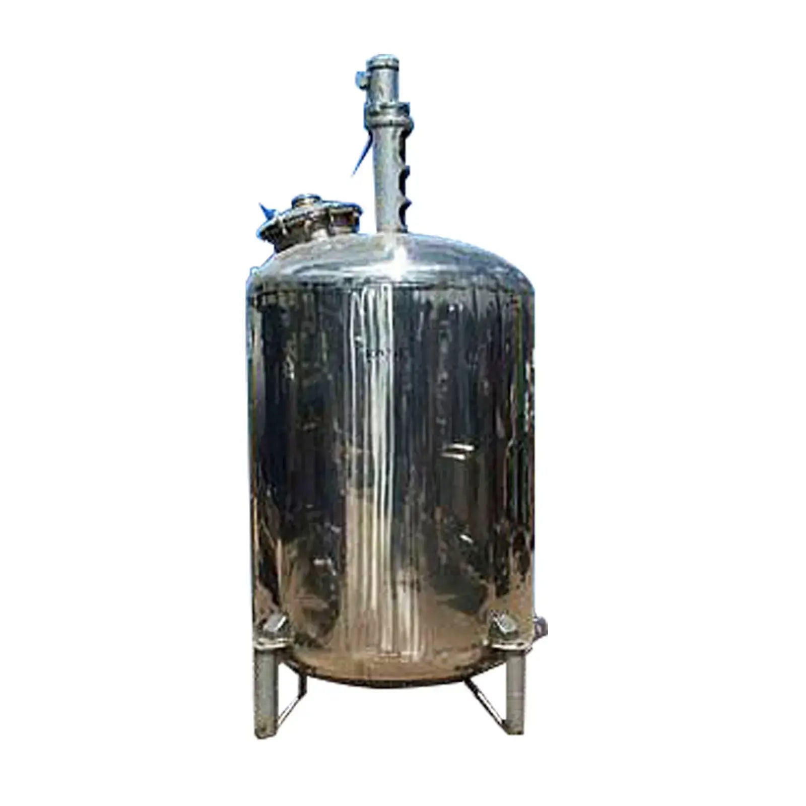 Polished Insulated Tank- 700 Gallon. Stainless steel. Tank features a dome top, dish bottom, top mounted agitator and a top manway with a sight glass. Includes motor, gear drive and shaft with two propellers. Inlets: (2) 1-1/2 in. S-line, 1 in. threaded (female). Outlets: (2) 1-1/2 in. S-line. (2) Sight glasses. Manway: 16 in. diameter. Overall Dimensions: 64 in. diameter x 10 ft. 4 in. (H).