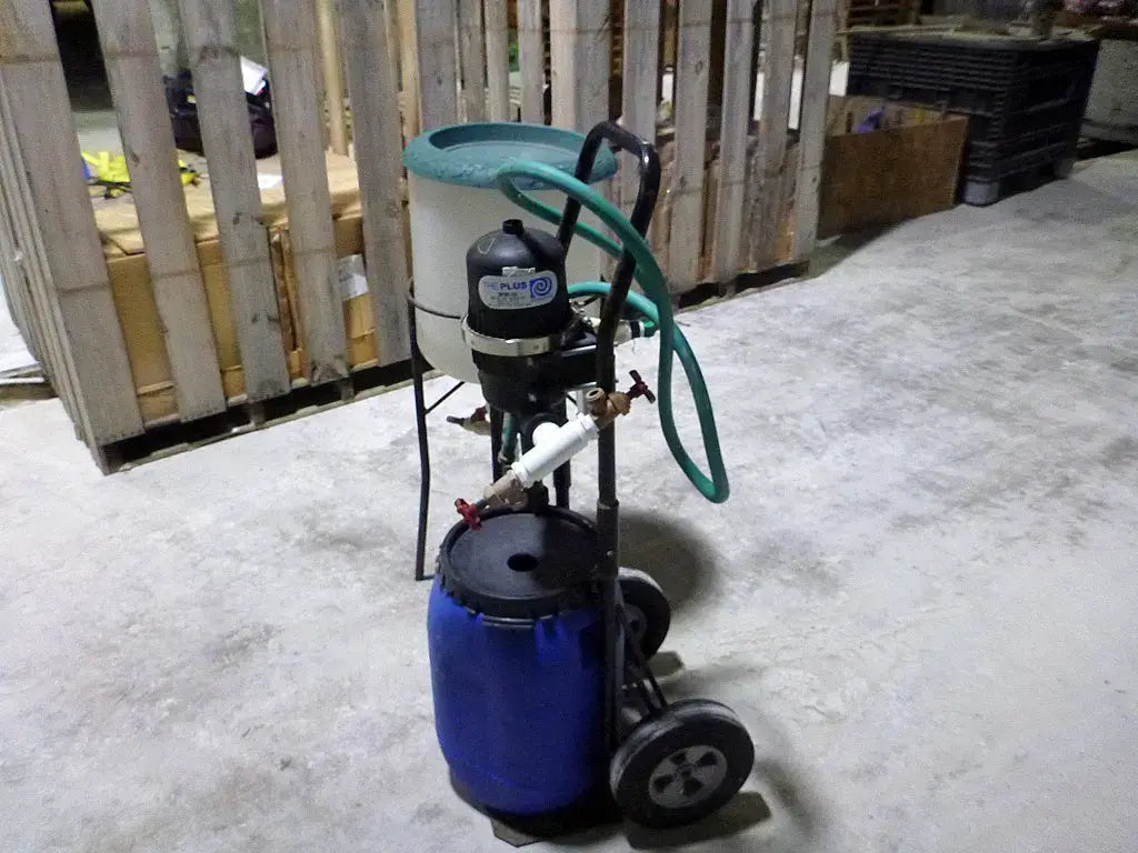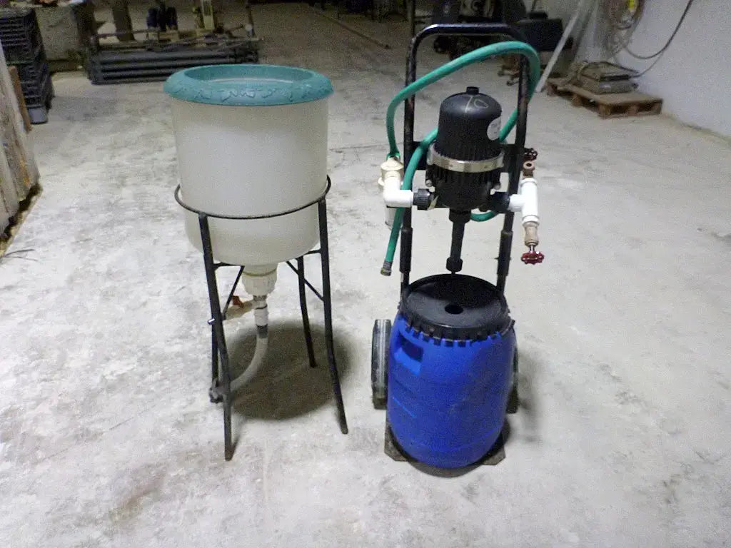 Portable Dosmatic The Plus Fertilizer Injector Pump with 8 gallon tank and shop made cone tank. This model is designed to feed water soluble chemicals recommended and approved for injection into water and applies to a variety of applications. Water treatment chemicals can also be applied.
