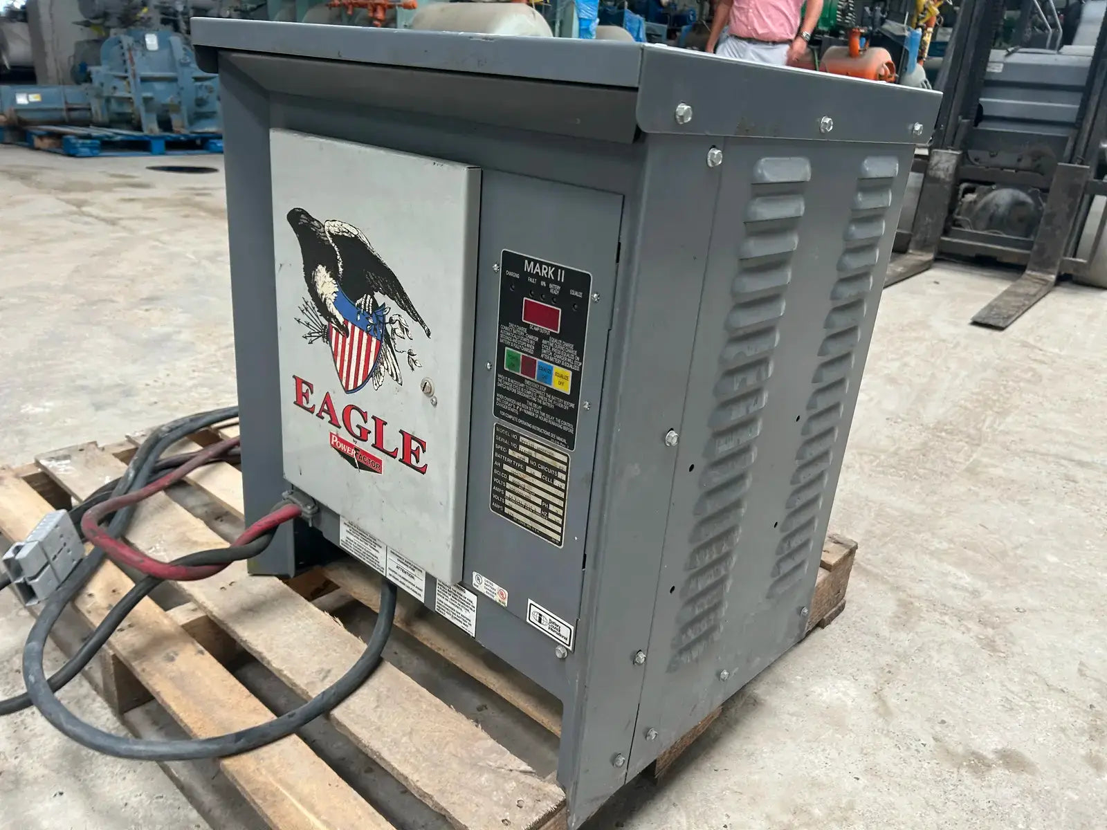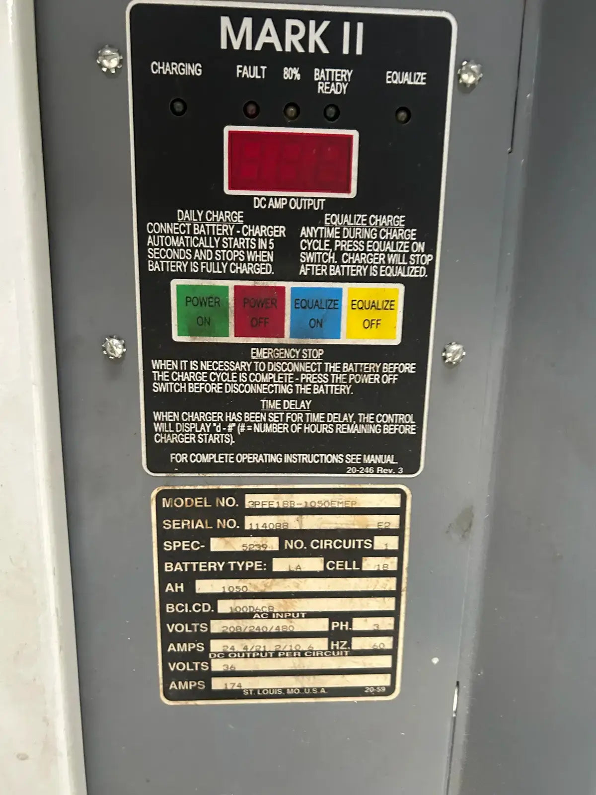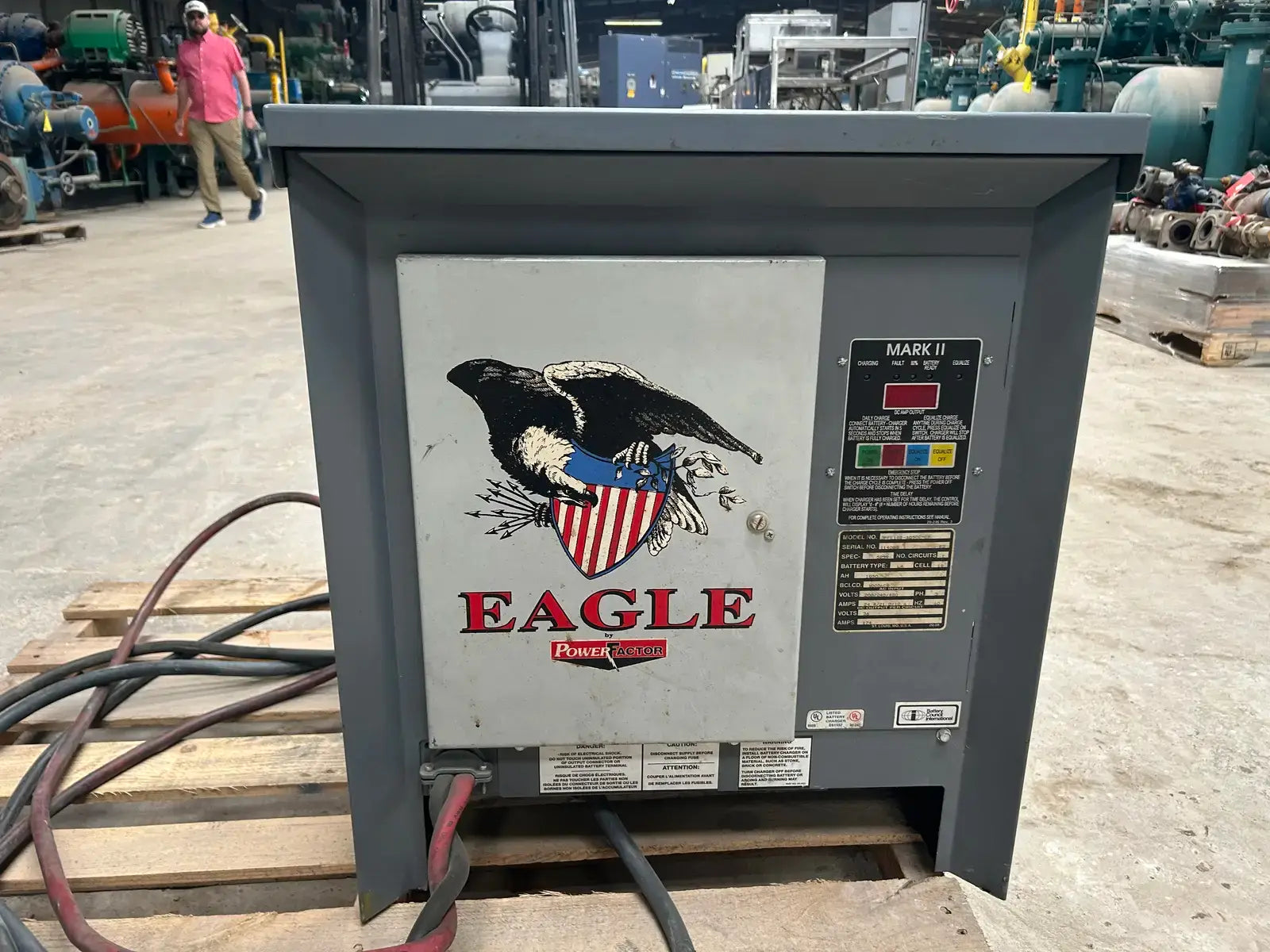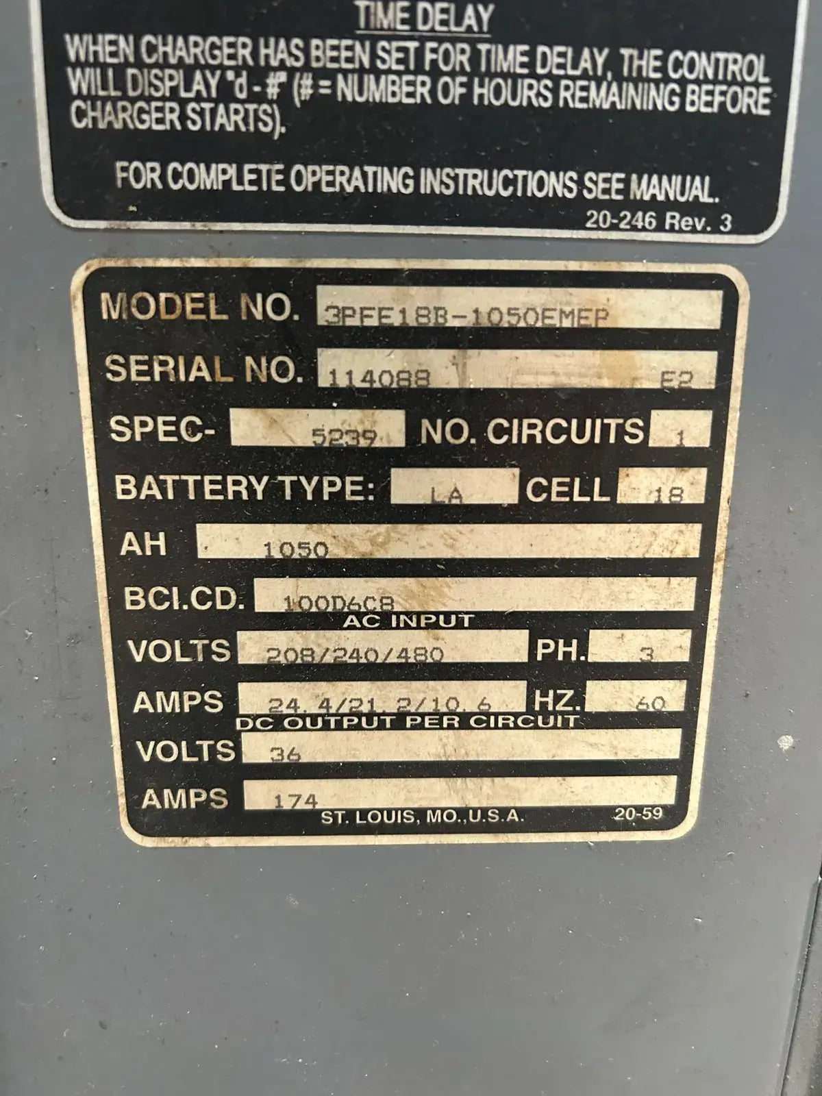Power Factor Eagle Series Battery. Model: 3PFE18B-1050EMEP. Serial No: 114088 E2. Spec: 5239. No Circuits: 1. Battery Type: LA. Cell: 18. AH: :1050. AC Input - Volts: 208/240/480, Ph: 3, Amps: 24.4/21.2/10.6, Hz: 60. VoltsL 36. Amps: 174.