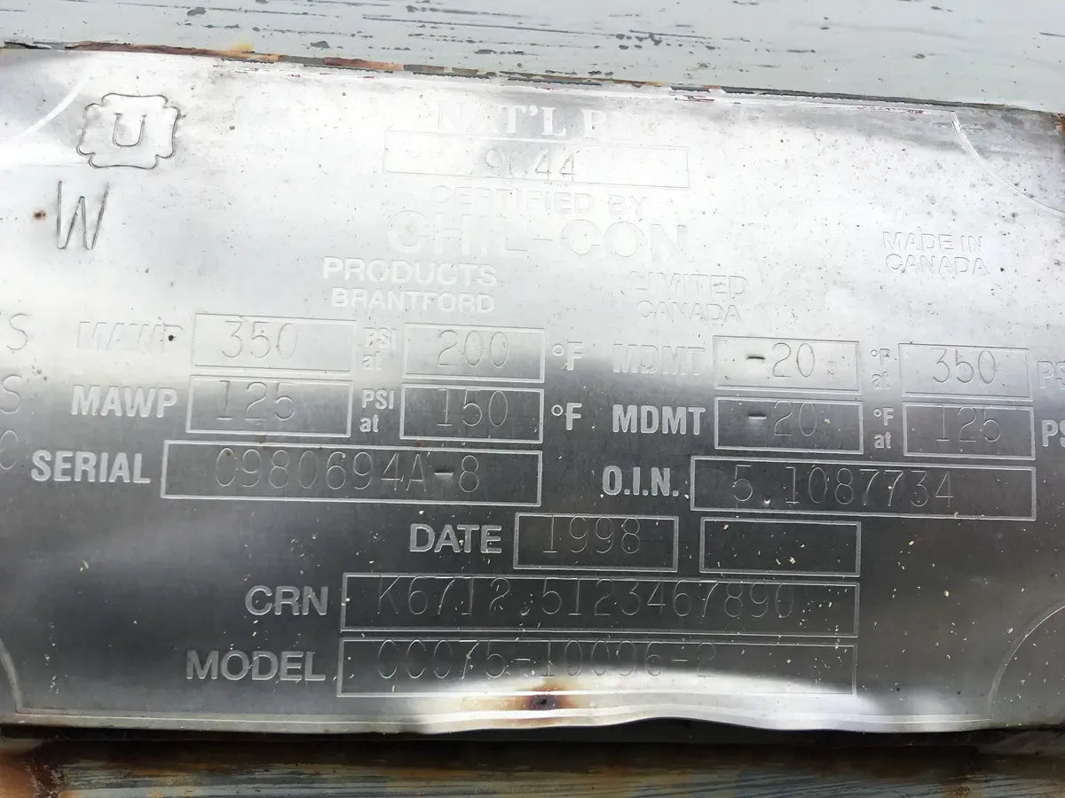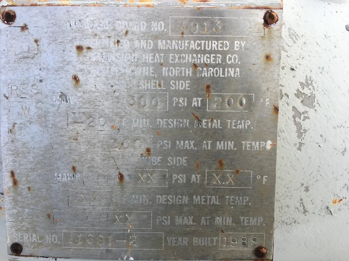 Precision Heat & Chil-Con Shell & Tube Heat Exchanger with Surge Drum. Certified and Manufactured by Precision Heat Exchanger Co Shell & Tube. National Board: 4913. Shell Side MAWP: 300 PSI @ 200 F. -20 Min. Design Metal Temperature. 300 PSI Max @ Min Temperature. Serial No: 11691-2 Year Built: 1998. Chil-Con Surge Drum. MAWP: 350 PSI @ 200 F. MAWP: 125 PSI @ 150 F. MDMT: -20 F @ 350 PSI. MDMT: -20F @ 125 F. Serial No: 0980694A-8. OIN: 5 1087734. Year Built: 1998. Model: 00075-10096-2.