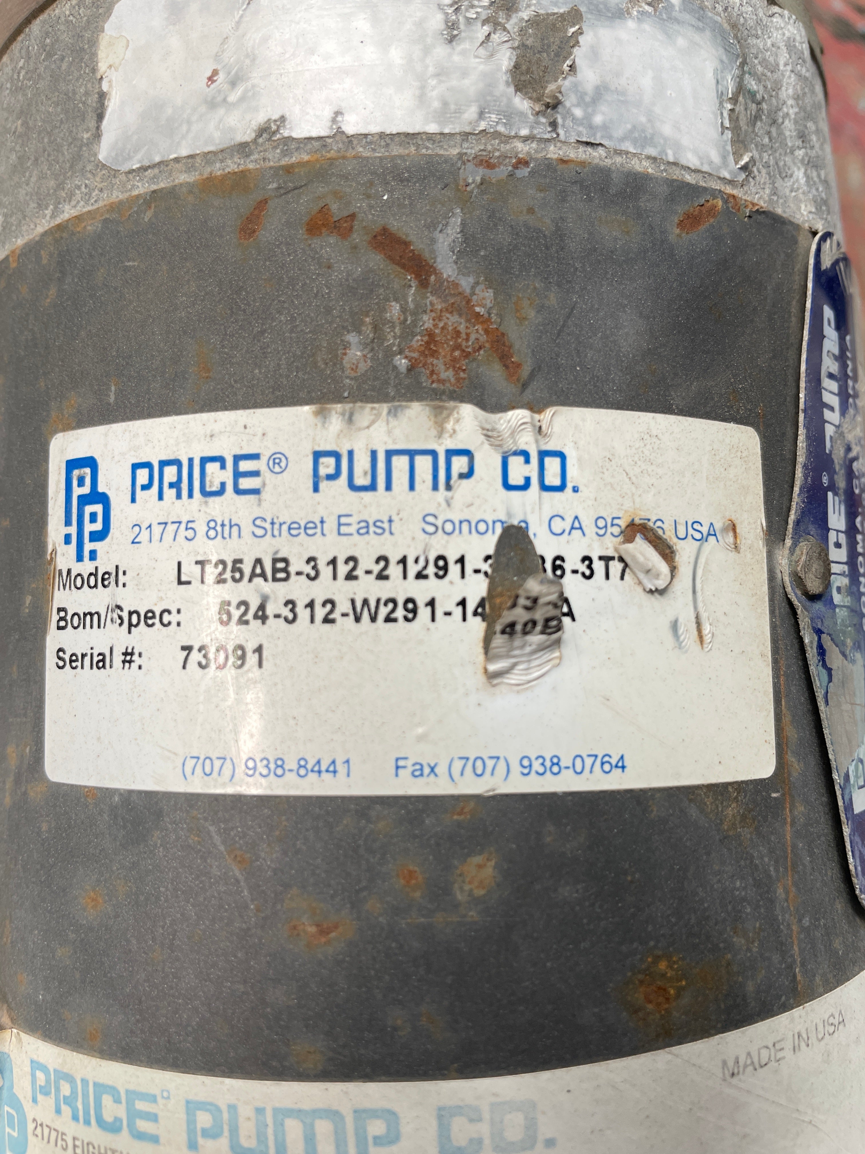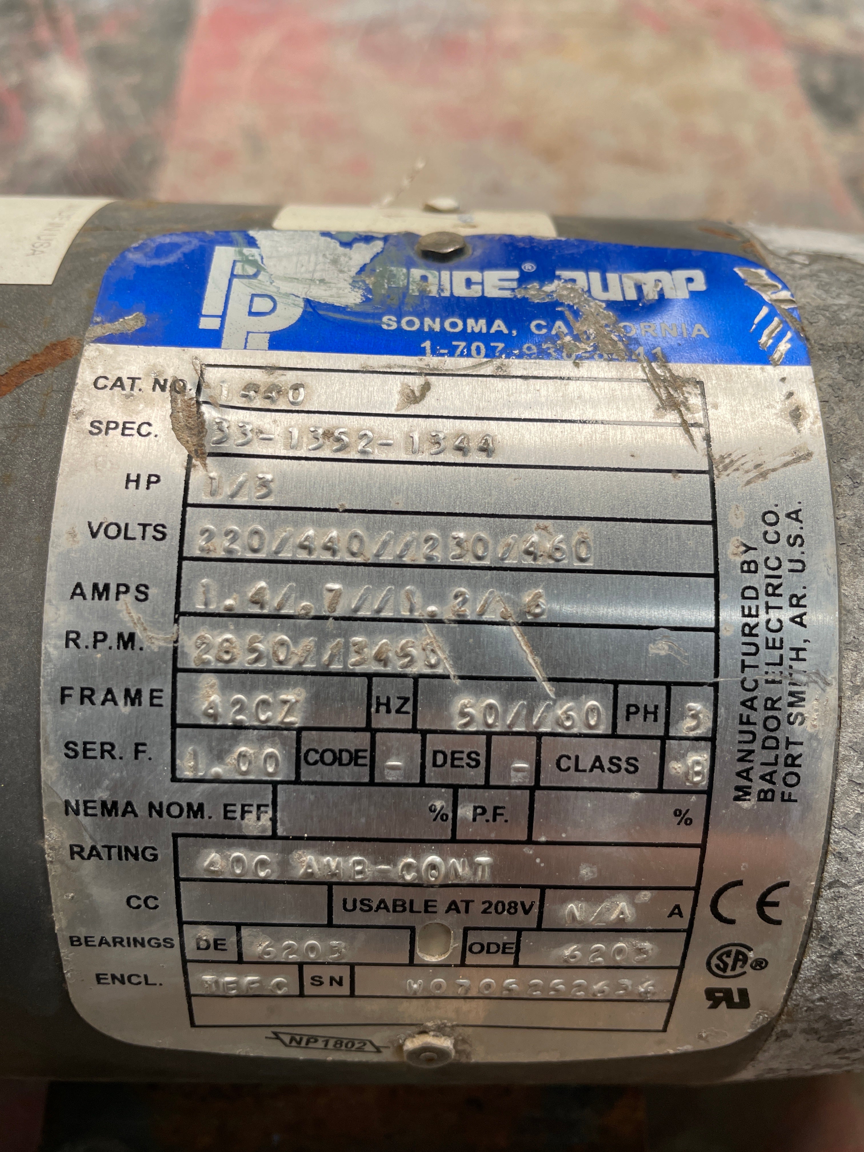 Price model LT25(AB) Pump. Model: LT25AB-312-21291-3336-3T7, Serial No: 73091. Volute and Impeller Material: Bronze. Standard Specifications - Discharge(in): .25 FNPT, Suction(in): 0.5 FNPT. Maximum Impeller Diameter(in): 3.34. Stub Shaft: 316 SS. Max GPM: 12, Max Head(ft): 48, Min. Flow: 0.5 GPM, Max Temp(F): 300. Price Pump Motor - Cat.No: 1440, Spec: 33-1352-1344, HP: 1/3, Volts: 220/440, Apms: 1.4/.7, RPM: 2850, Frame: 42CZ, Hz: 60, PH: 3, Rating: 40C Amb-Cont.