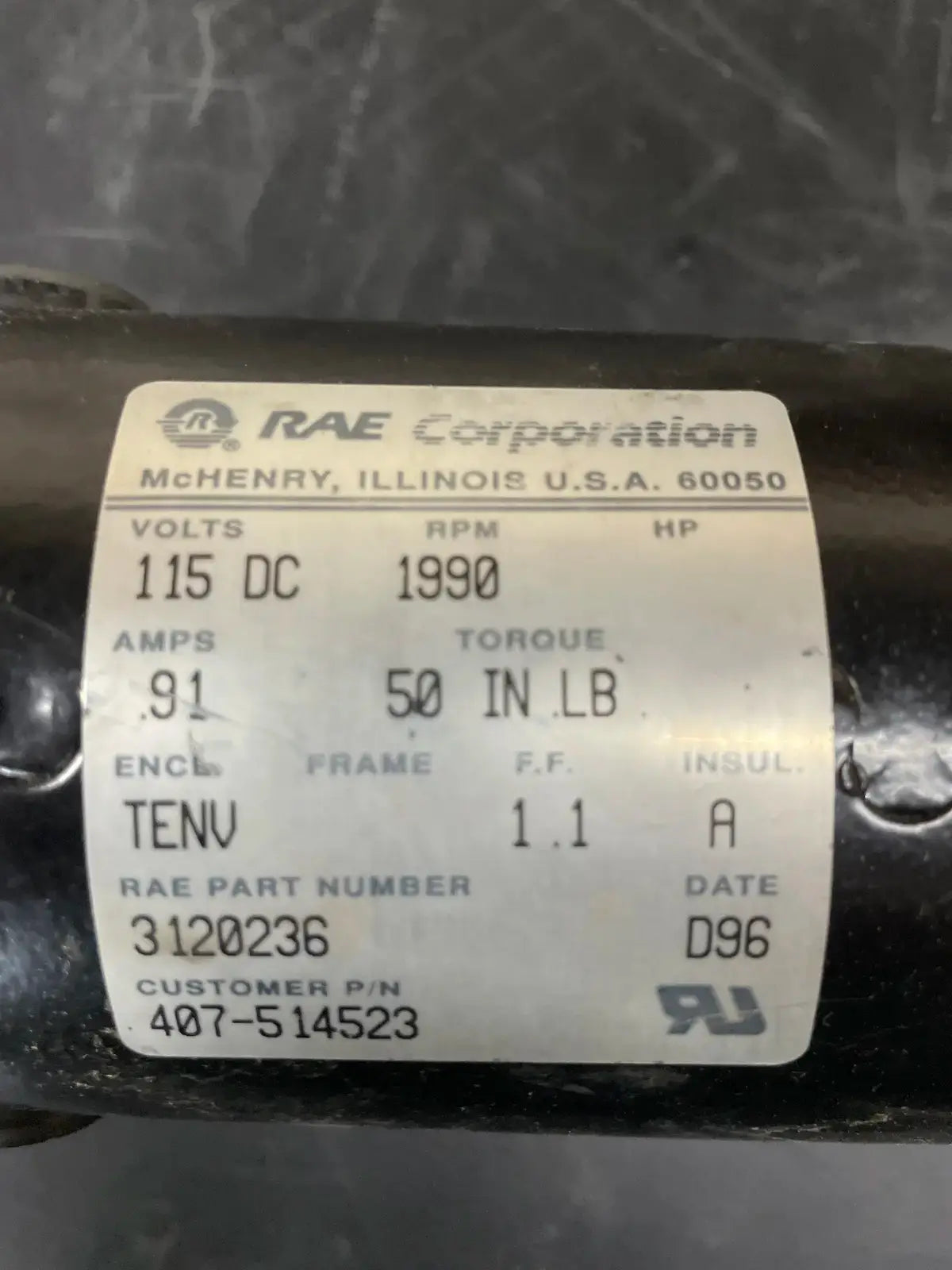 RAE Corporation DC Motor. Volts: 115 DC. RPM: 1990. Amps: .91. Torque: 50 IN LB. Encl: TENV. RAE Corporation Part Number: 3120236. Customer P/N: 407-514523.