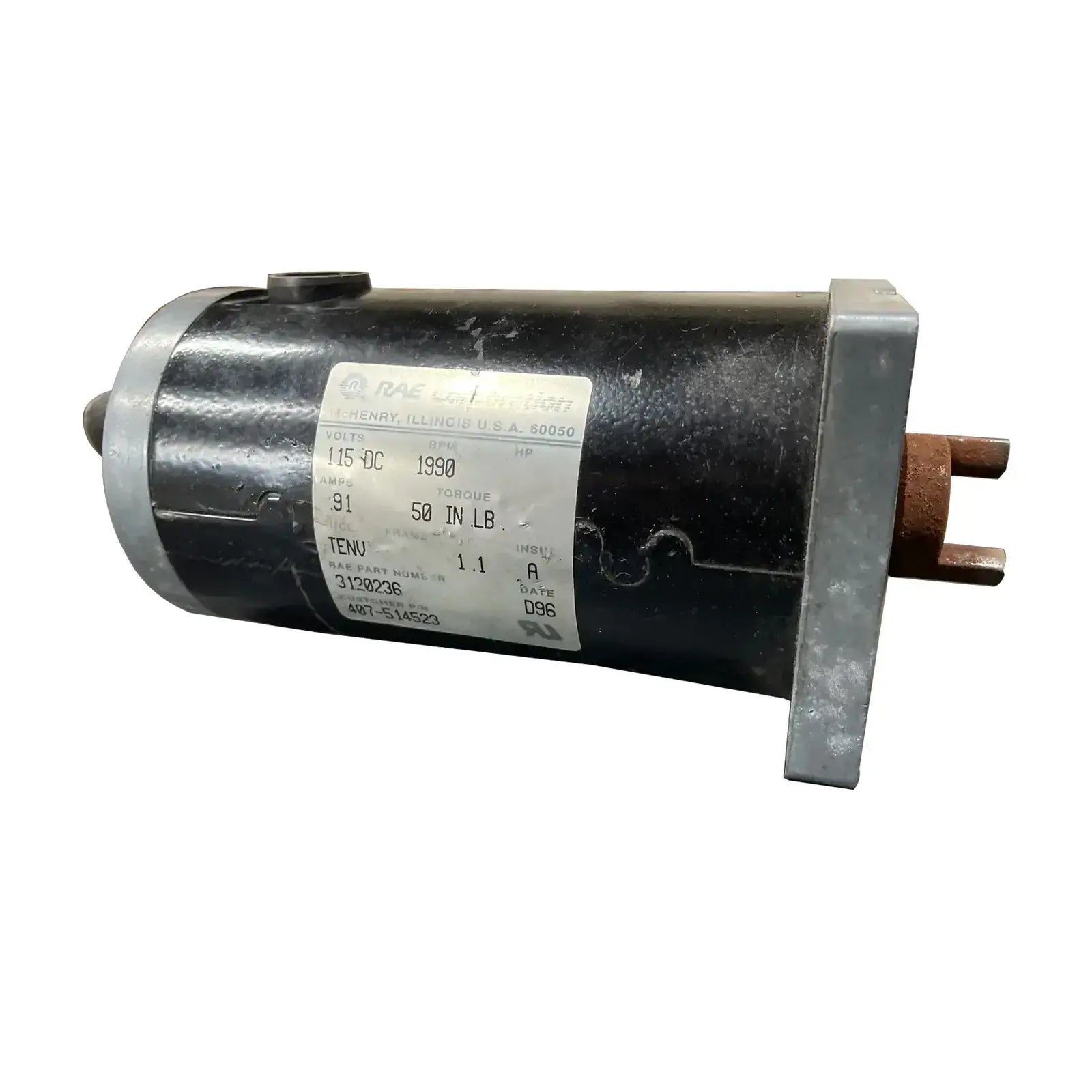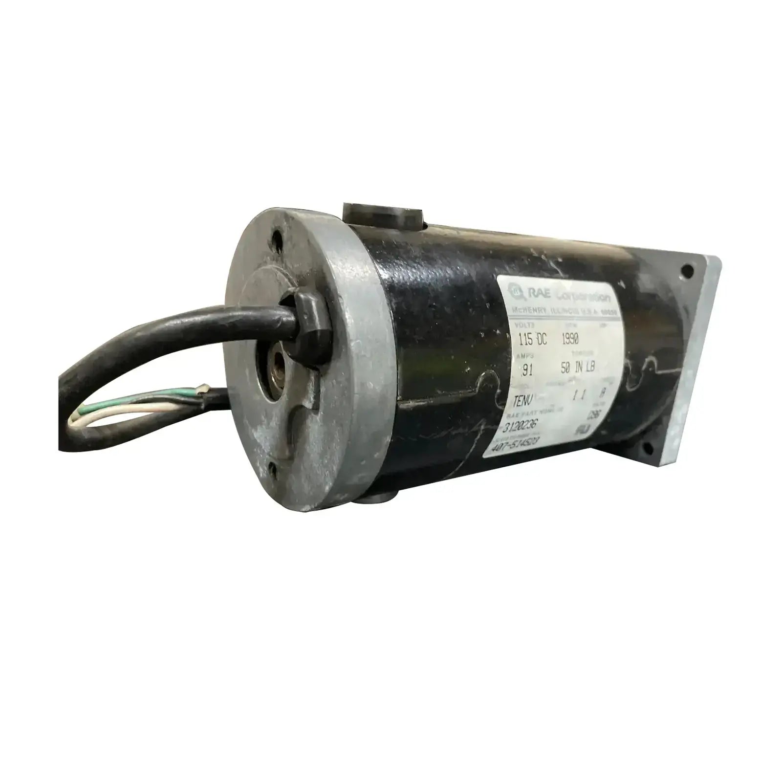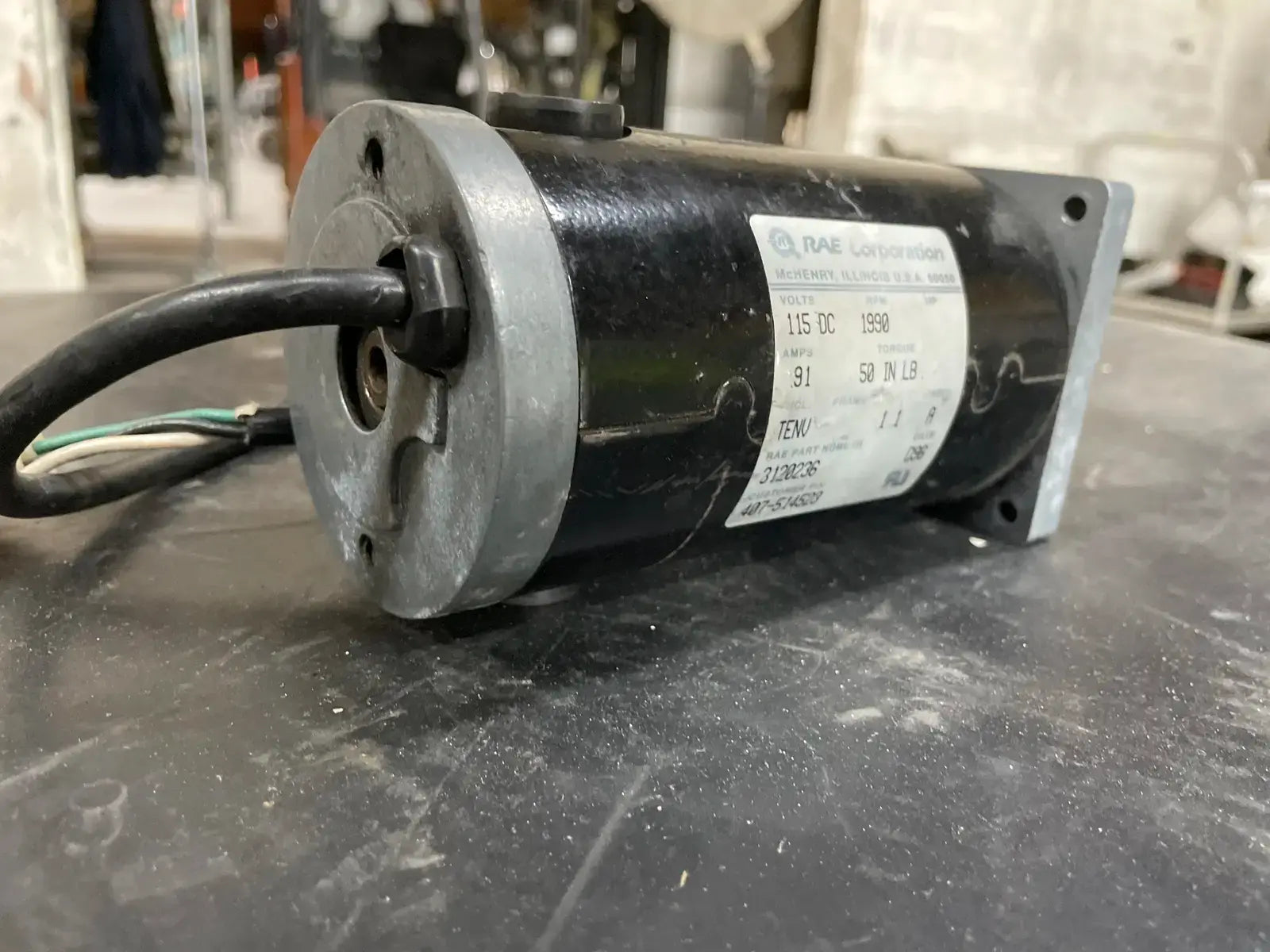 RAE Corporation DC Motor. Volts: 115 DC. RPM: 1990. Amps: .91. Torque: 50 in LB. RAE Corporation Part Number: 3120236. Customer P/N: 407-514523. Date: D96.