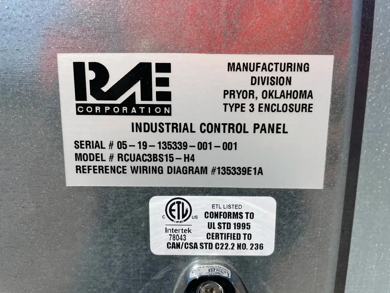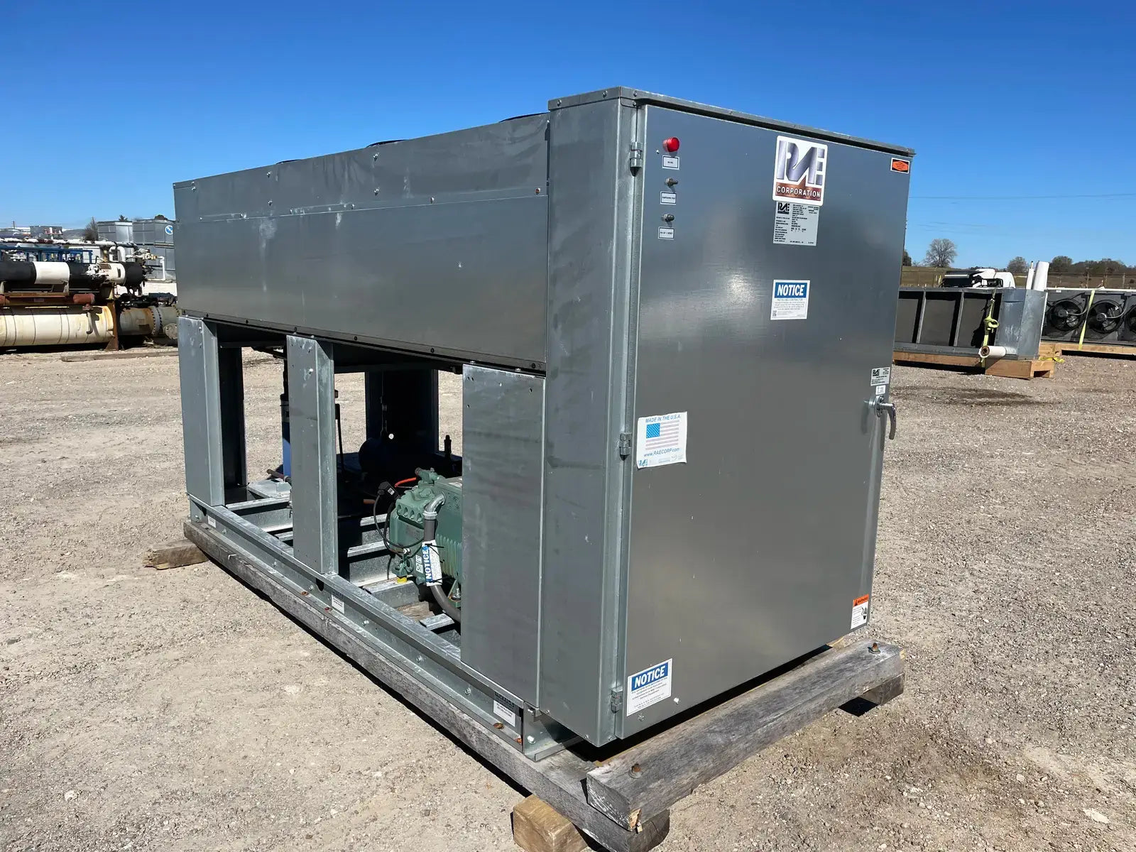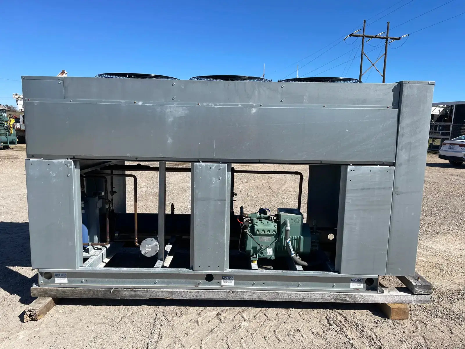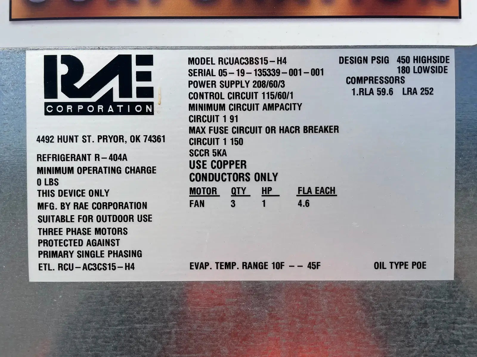 Unused RAE Corporation Air Cooled Condenser. Model: RCUAC3BS15-H4. Serial No: 05-19-135339-001-001. Power Supply: 208/60/3. Control Circuit: 115/60/1. Design Pressure(PSIG): 450 High Side, 180 Low Side. Bitzer Us, Inc Compressor(1): 15 HP, RLA: 59.6, LRA: 252. Fan Motors (1): Qty: 3, HP: 1, FLA Each: 4.6. Evap. Temperature. Range: 10F - 45F. Suitable for outdoor use. Previous Refrigerant: R-404A.