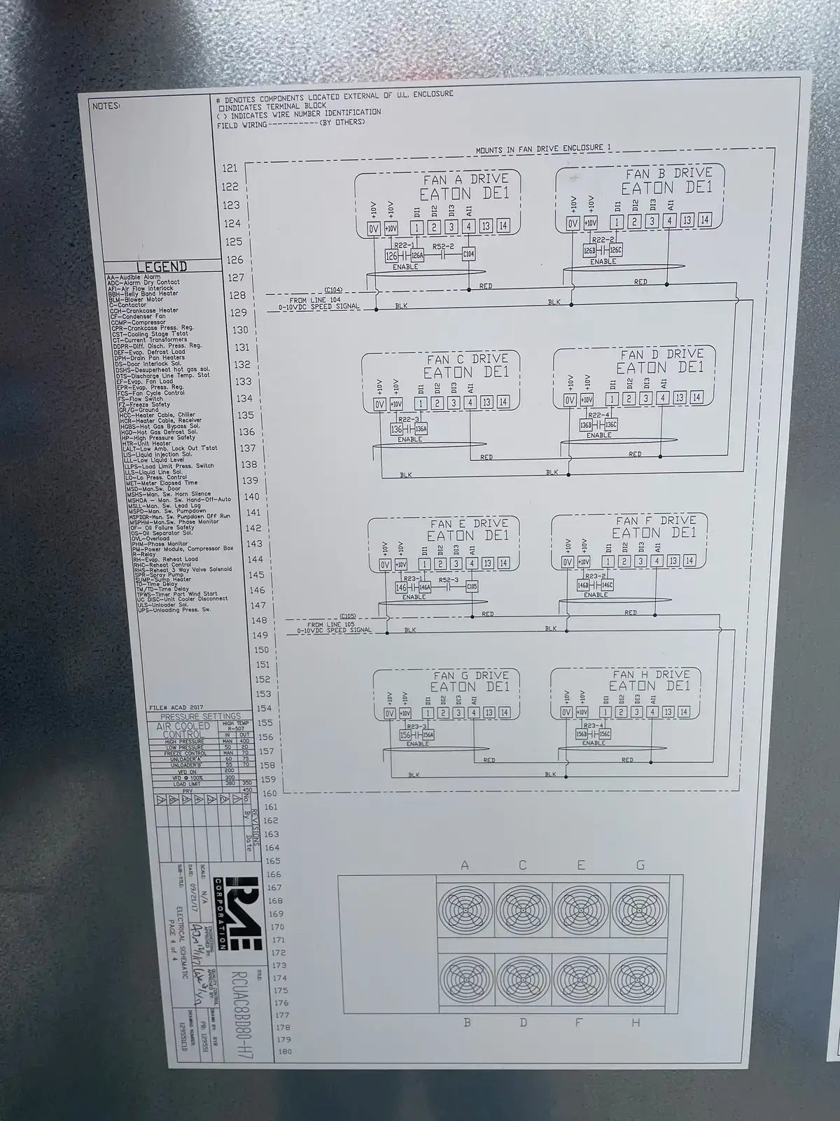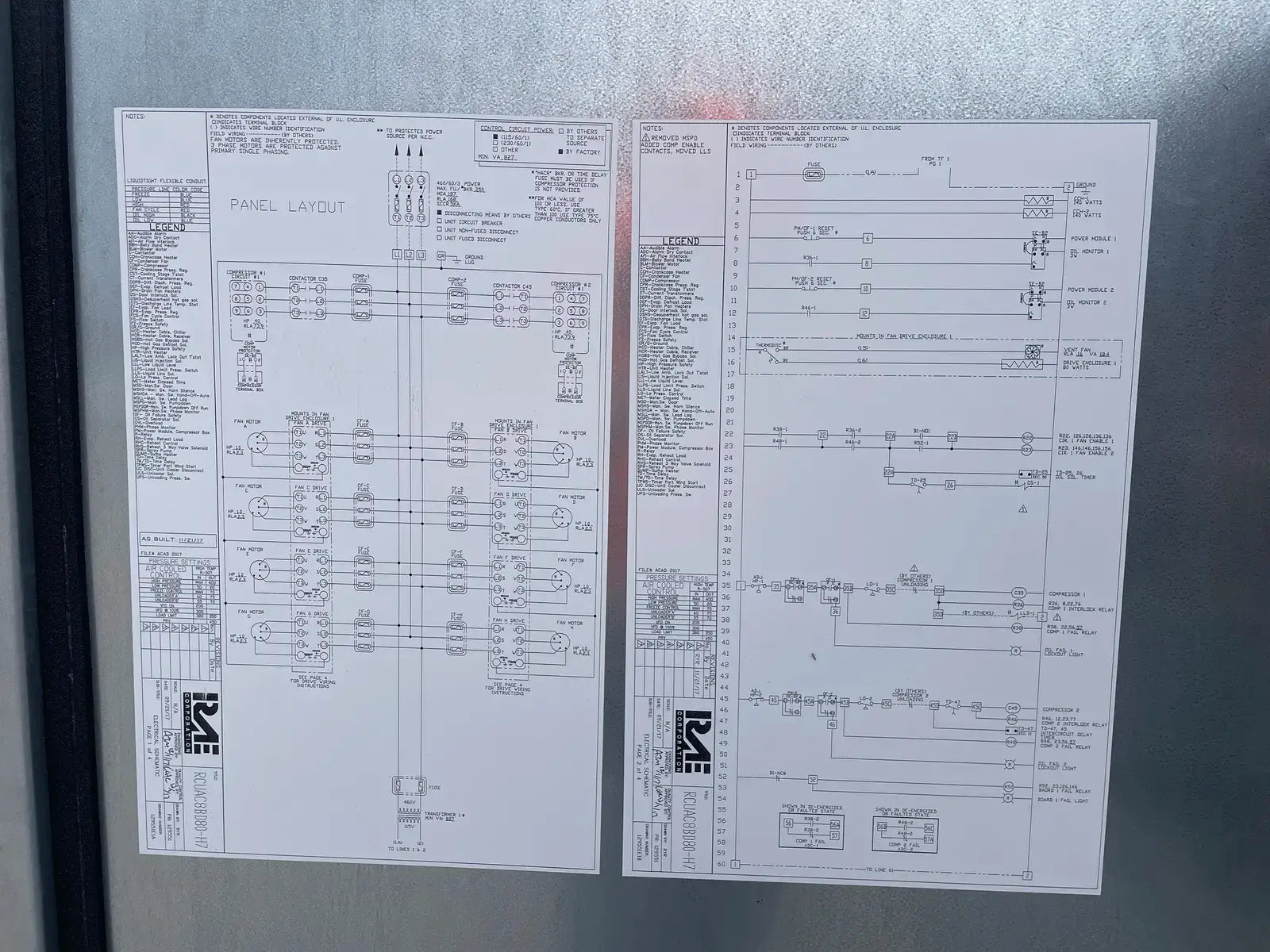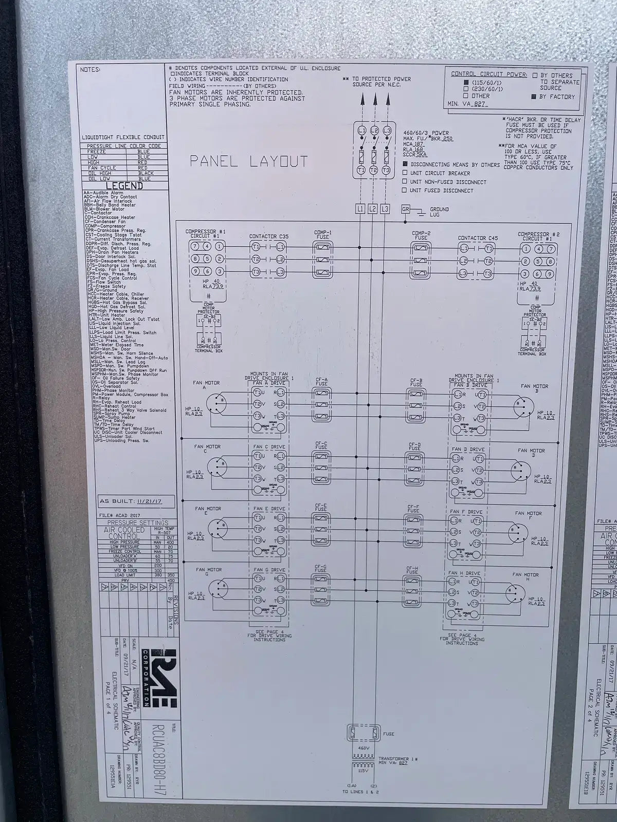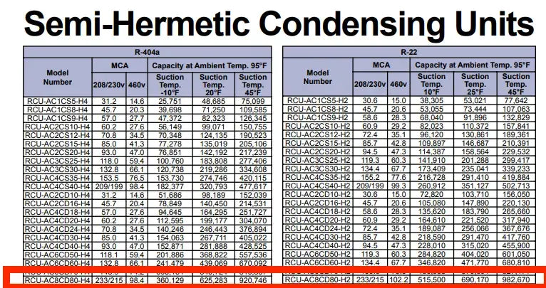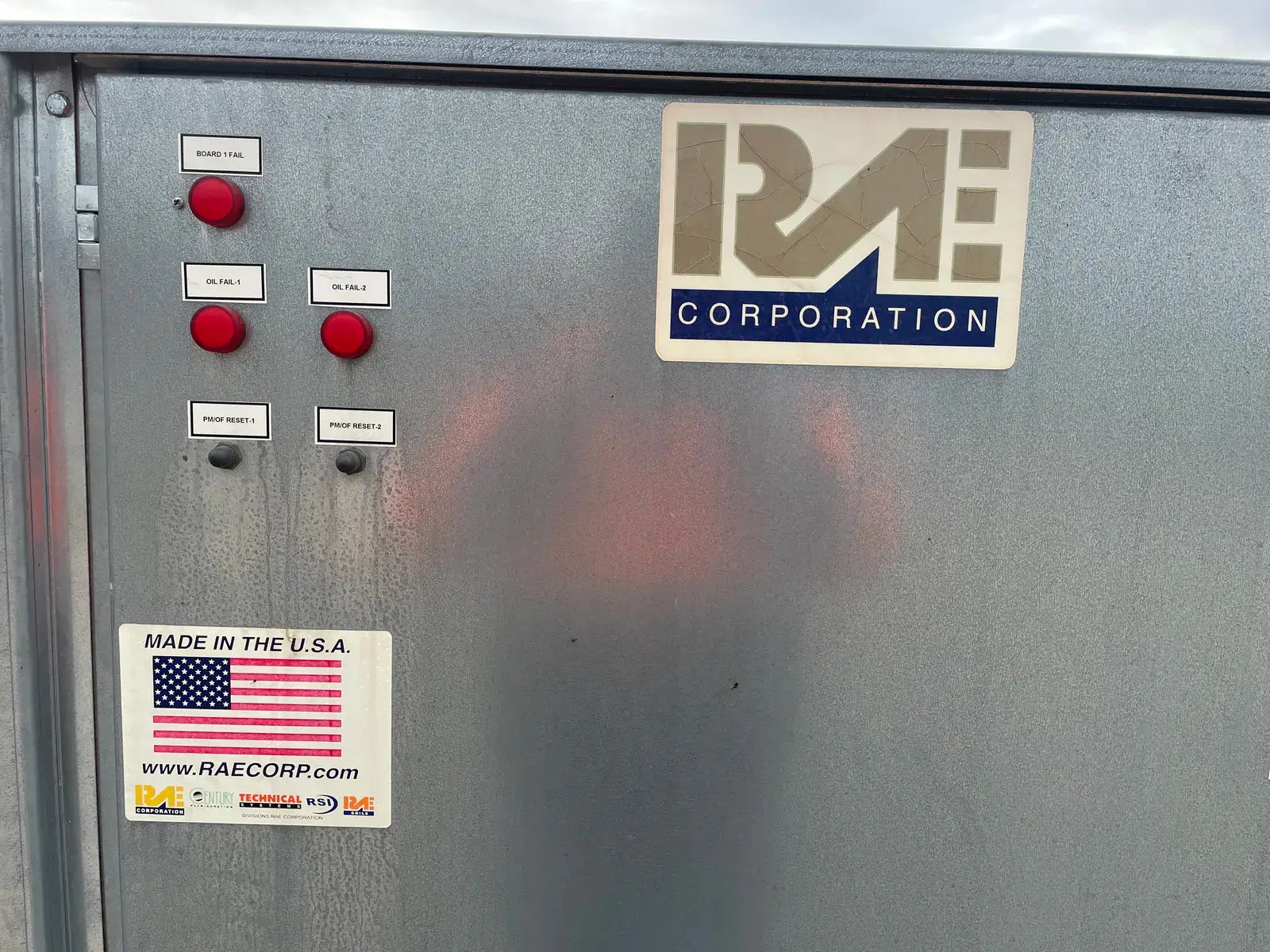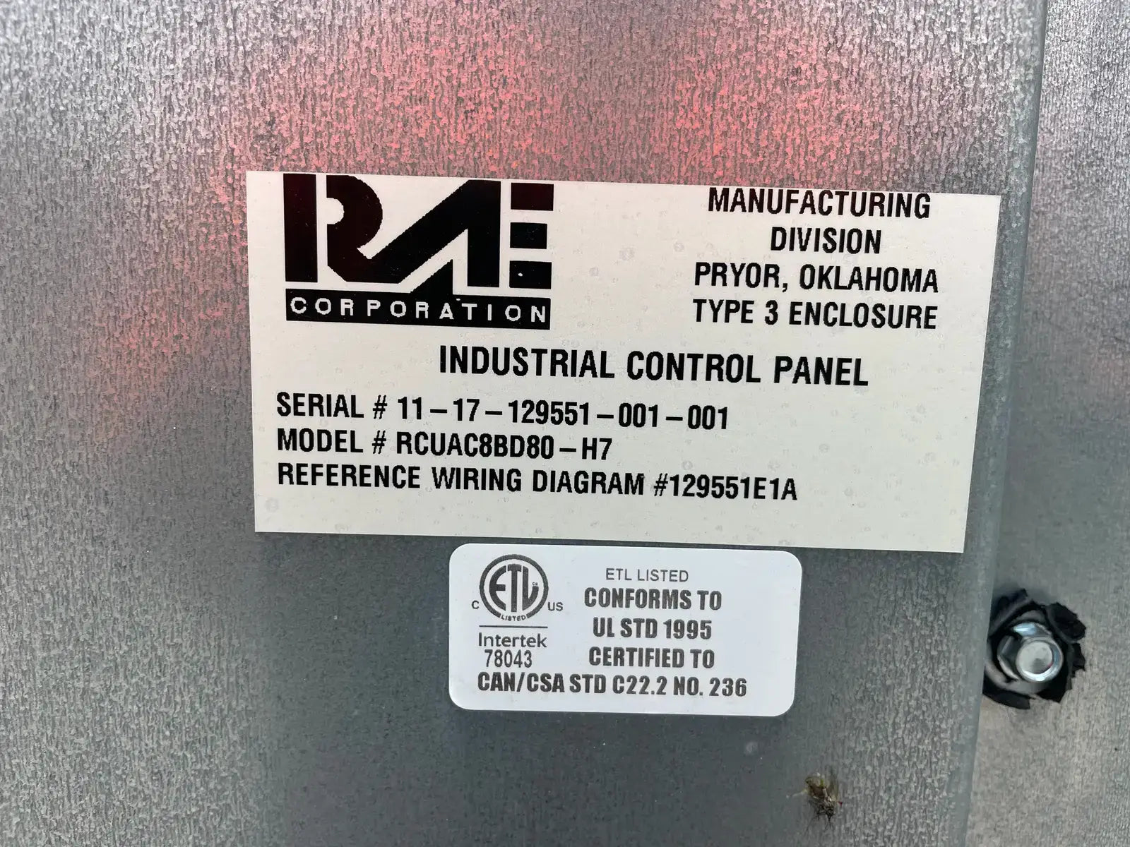 RAE Corporation Air Cooled Condenser. Model: RCUAC8BD80-H7. Serial No: 11-17-129551-001-001. Power Supply: 460/60/3. Refrigerant: R-507. Minimum Operating Charge: 0 LBS. Design PSIG - High side: 450, Low Side: 180. Bitzer US, Inc Compressors(2): 1: Type: 6GE-40-2NUHP: 80, RLA: 73.9, LRA: 350. (2): HP: 80, RLA: 73.9, LRA: 350. Fan Motors: Qty: 8, HP: 1, FLA Each: 2.3. Suitable for Outdoor use.