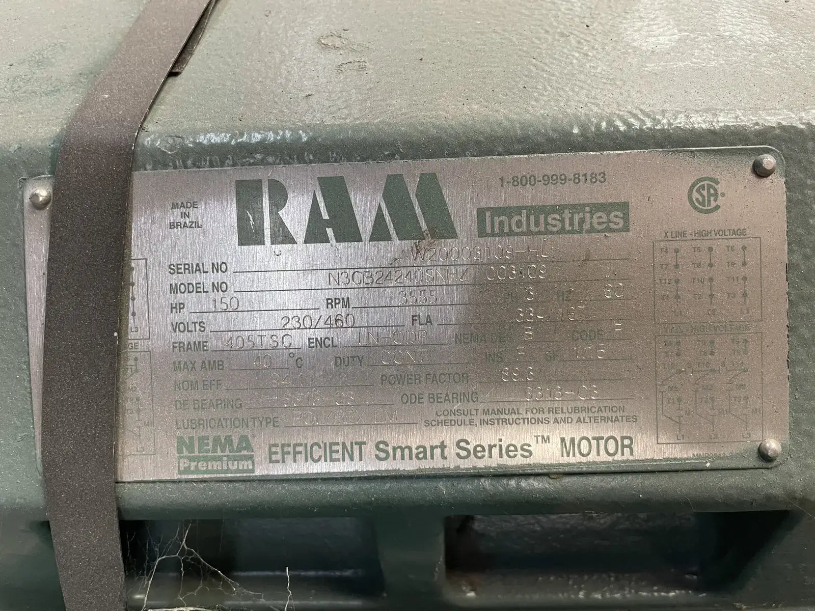 RAM Industries Efficient Smart Series Electric Motor. Model: N3CB24240SNHZ-003109. Serial No: W20003109-HL. Power Supply - 150 HP, 230/460 Volt, 60 Hz, 3 Ph, 334/167 FLA, 405TSC FR. LN-ODP Enclosure.