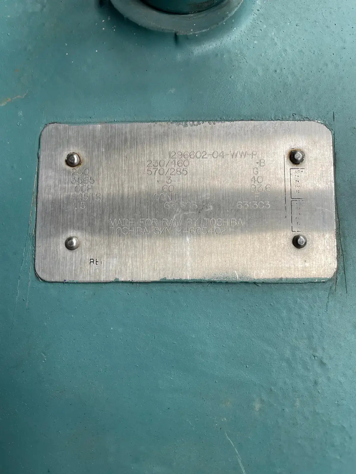 Ram Industries Motors & Controls High-Efficiency Motor. Serial No: 1296602-04-WW-P. Power Supply - HP: 250, RPM: 3565, Volts: 230/460, Amps: 570/285, Ph: 3, Hz: 60, Duty: Cont. Made for Ram Industries by Toshiba.