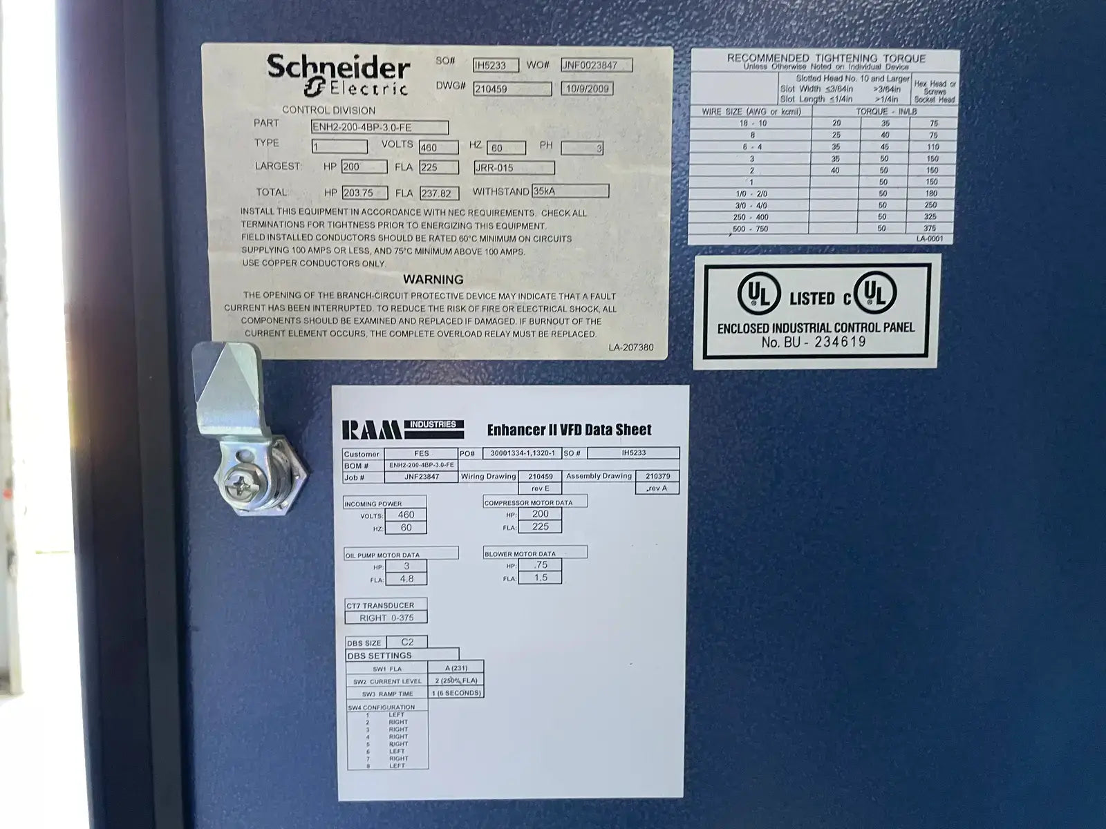 Ram Industries Screw Compressor VFD/Soft Motor Starter. Part/Type: ENH2-200-4BP-3.0-FE. Work Order No: JNF0023847. Power Supply; Type: 1, Largest Hp: 200, FLA: 225, Volt: 460, Hz: 60, Ph: 3. Total; HP: 203.75. FLA: 237.82, Withstand: 35kA.