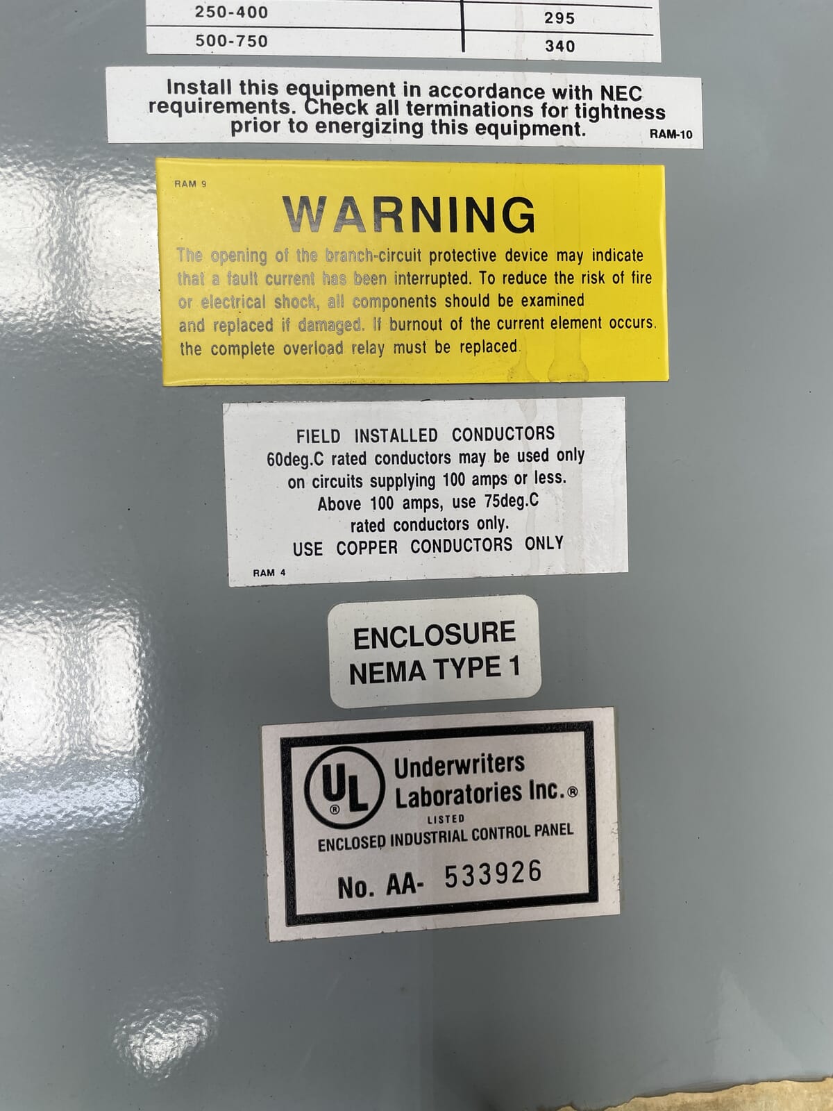 Ram Industries Screw Compressor Motor Starter. Job No: SOP3013756, Drawing No: FZC-4250Y1013. Power Supply - 460 Volts, Ph: 3, Hz: 60. Max Motor - 250 HP, FLA: 296.