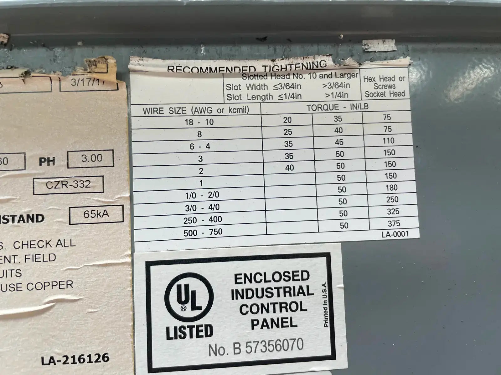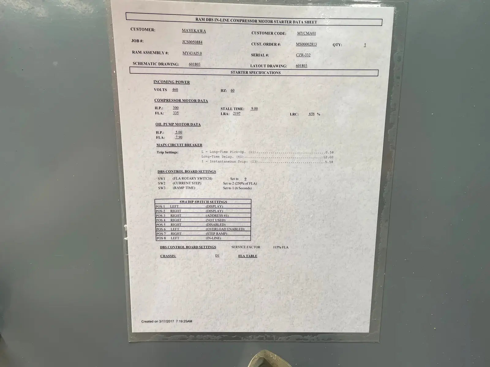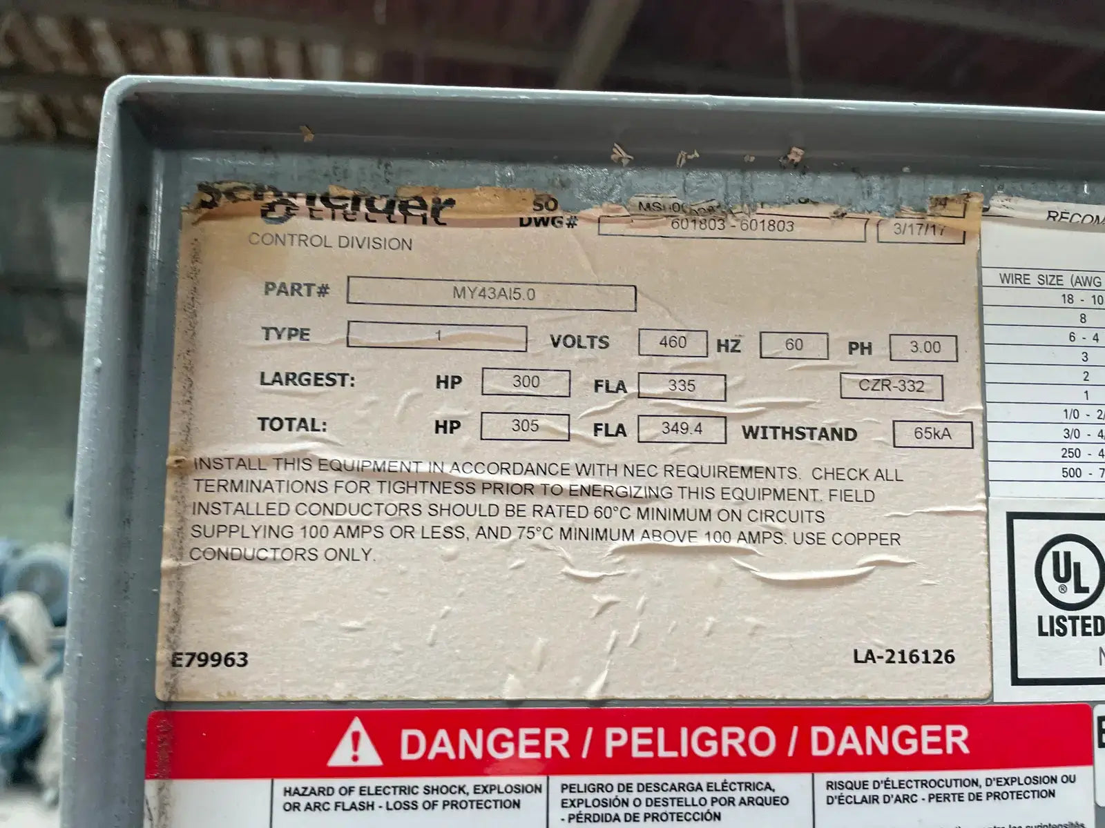 Ram Industries Screw Compressor Motor Starter. Part No: MY43AI5.0. Drawing No: 601803-601803. Manufacture Date: 3-17-17. Power Supply - Hp: 300, Volts: 460, 60 Hz, 3 Ph, 335 FLA, 65 kA Withstand.