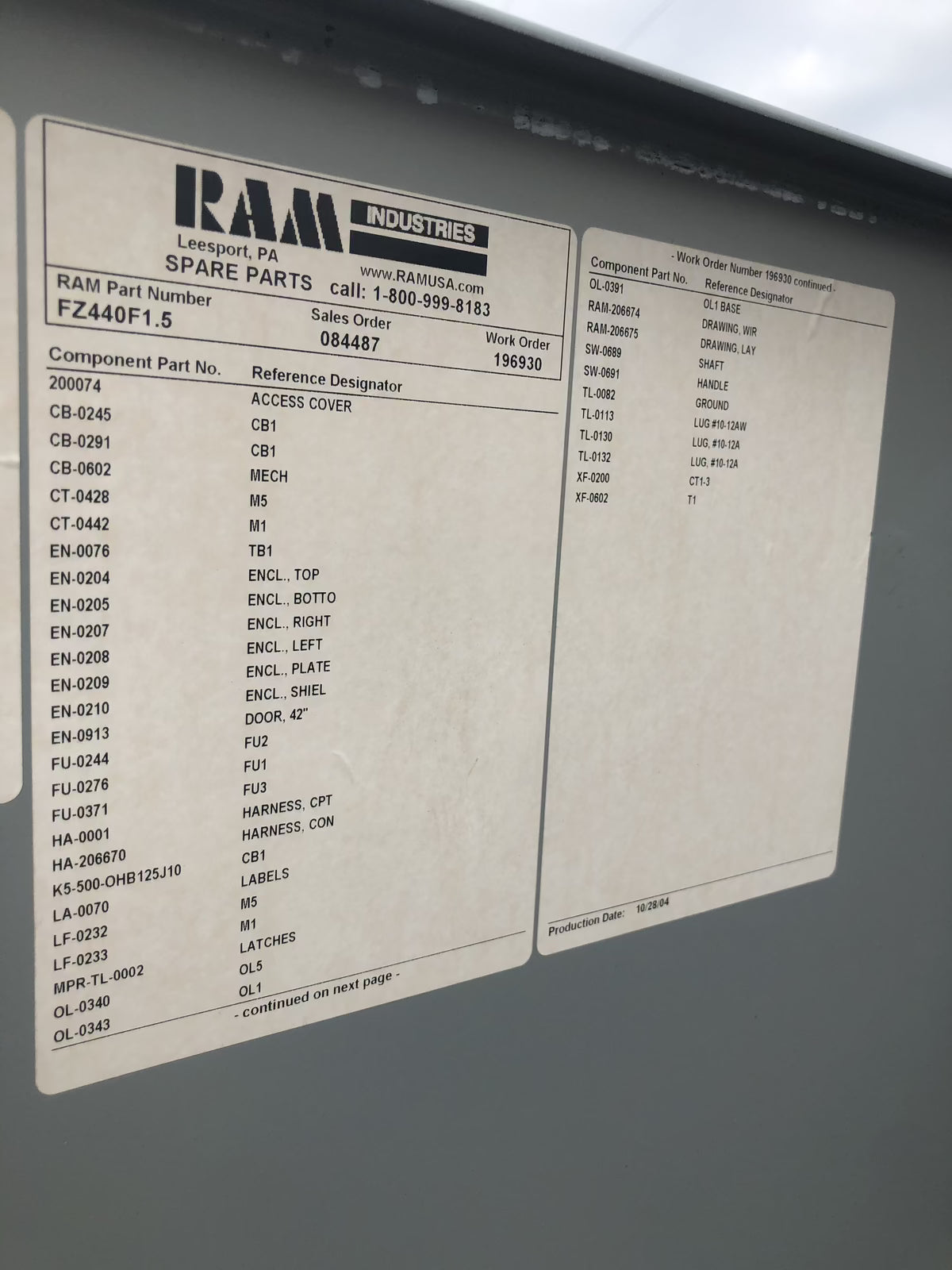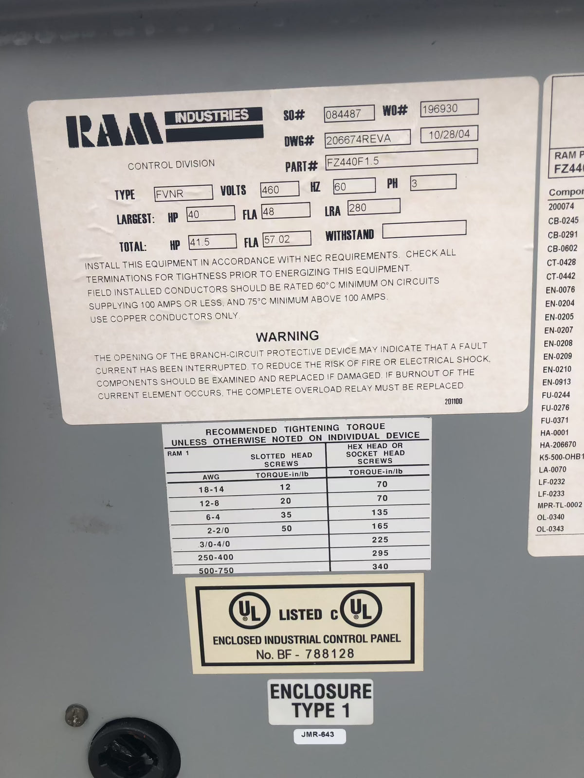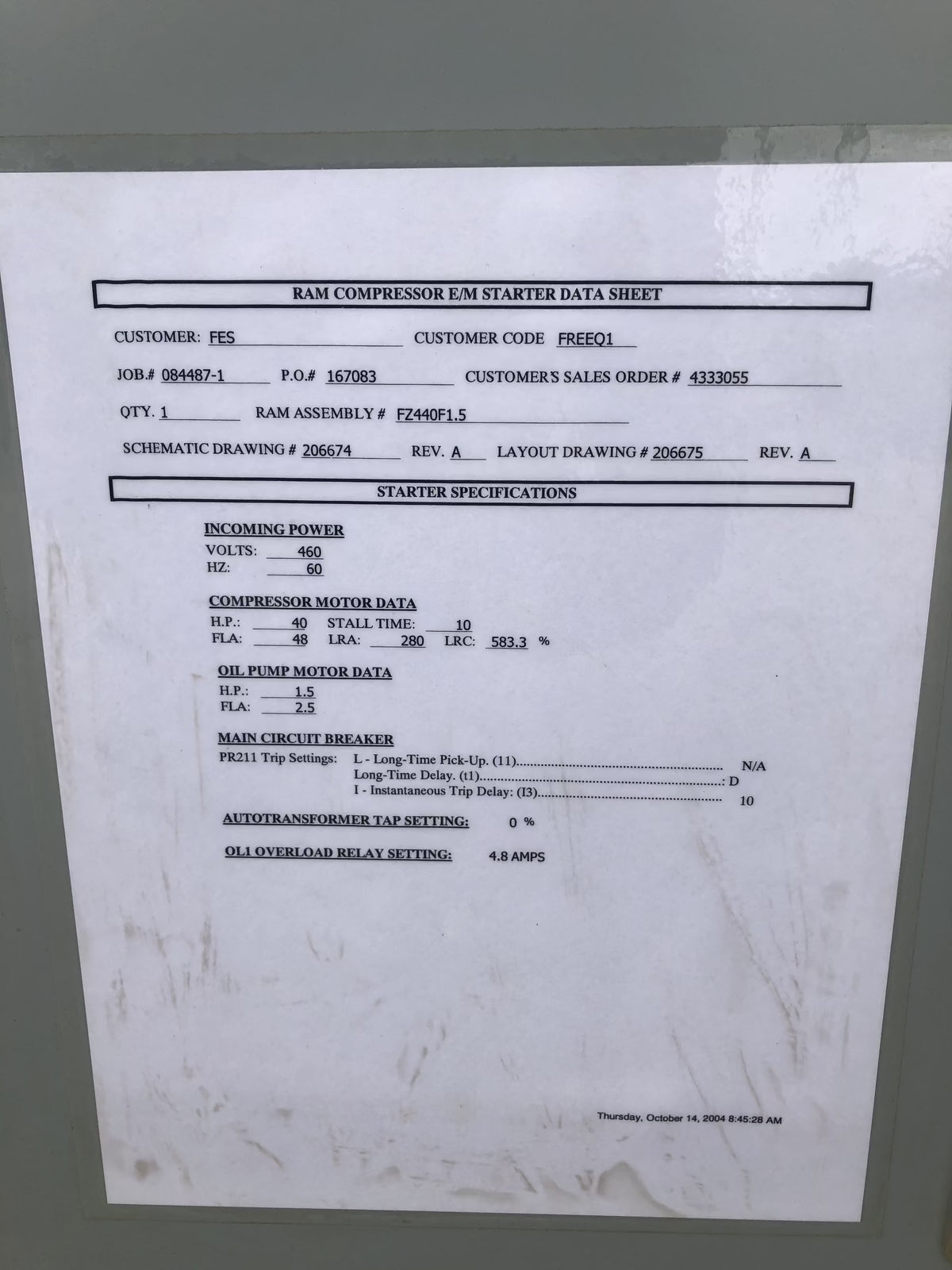 Ram Industries Screw Compressor Motor Starter. Type: FVNR. Drawing No: 206674REVA. Part No: FZ440F1.5. Power Output: 460 Volts, 60 Hz, 3 Ph, Largest Hp: 40, FLA: 48, LRA: 280.