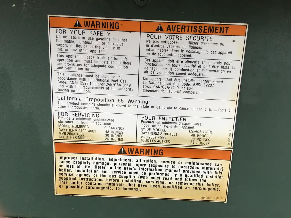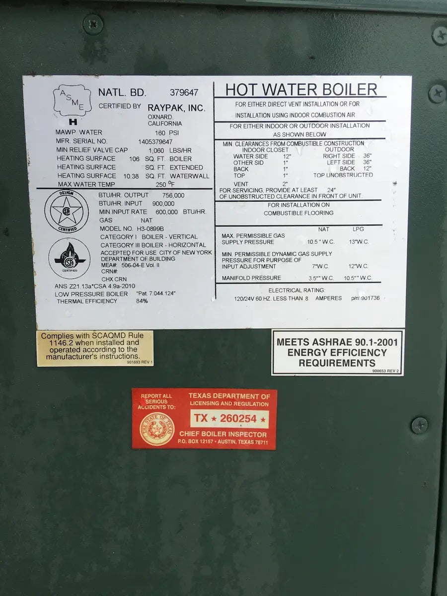 Delta Hot Water Boiler: Model: H3-0899B National Board: 379647, MAWP Water 160 Psi, MFR Serial No: 1405379647, Min Relief Valve Cap: 1,060 lbs, Heating Surface: 106 Sq Ft Boiler, Heating Surface: 10.38 Sq Ft Waterfall, Max Water Temp: 250F. BTU/HR Output: 756,000, BTU/HR: 900,000, Min Input Rate: 600,000, Gas: NAT, Model No: H3-0899B. Category 1 Boiler Vertical, Category 2 Boiler- Horizontal. Low Pressure Boiler Thermal Efficiency. Max Permissible Gas Supply Pressure: NAT: 10.5 W.C, LPG: 13 W.C. Min Permissible Dynamic Gas Supply Pressure For Purpose of Input Adjustment: NAT 7 W.C, LPG 12 W.C. Manifold Pressure: NAT 3.5 W.C, LPG: 10.5 W.C. Electrical Rating: 120/24V, 60 Hz less than 8 Amp. For Either Indoor Or Outdoor.