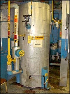 Reco Ammonia Intercooler. Refrigerant: R-717 (Ammonia). Approximate capacity: 350 gallons. Inside straight–wall dimensions: 3 ft. dia. x 6 ft. 1 in. H. MAWP: 150 psi at 300ºF. Head thickness: .250 in. Shell thickness: .250 in. Radius: 2:1 elliptical ends. Inlets: (1) 6 in. dia. port, (1) 1-1/2 in. dia. port. Outlets: (1) 6 in. dia. port, (2) 1 in. dia ports. (2) Refrigerant float valves. (2) Pressure relief valves mounted on a dual manifold valve. Overall dimensions: 5 ft. 6 in. L x 5 ft. 6 in. W x 10 ft. H.(HB2)