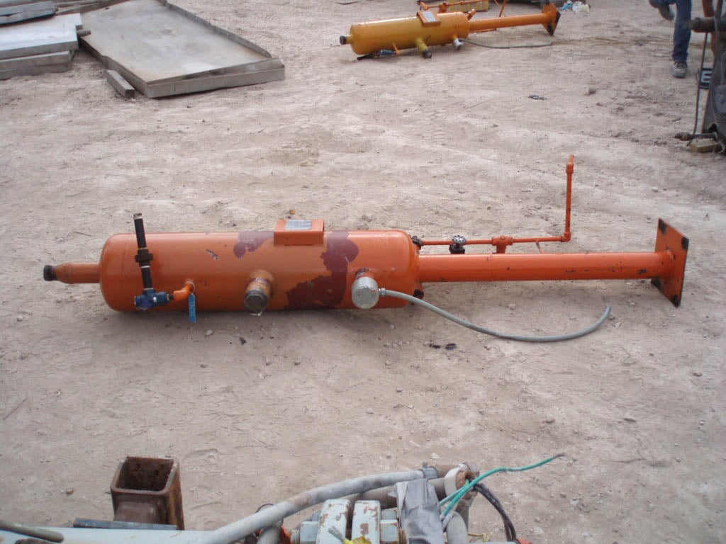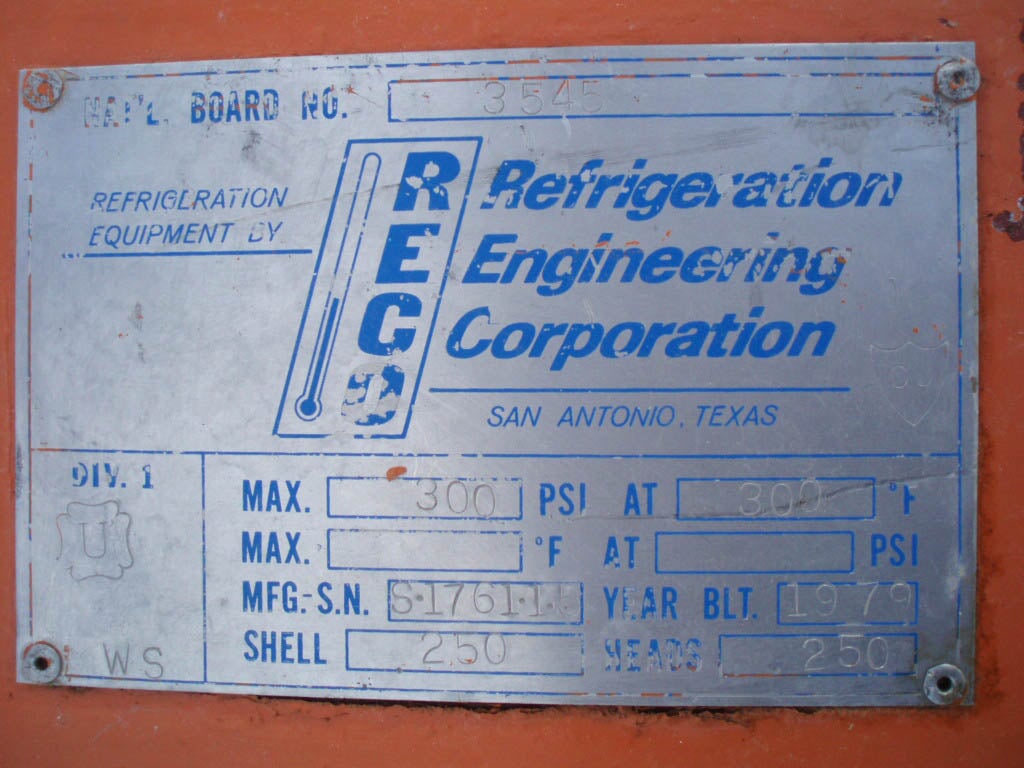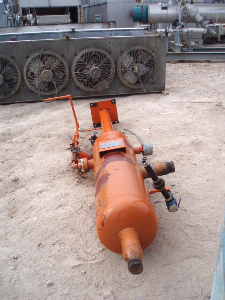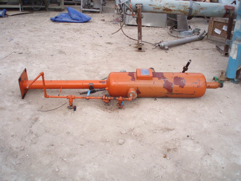Reco Oil Separator. S/N: S-1761-1-5. Nat'l Bd: 3545. Approximate capacity: 17.8 gallons. Inside straight-wall dimensions: 11 in. dia. x 3 ft. 5 in. L. MAWP: 300 psi @ 300°F. Head thickness: 0.250 in. Shell thickness: 0.250 in. Radius: 2:1 elliptical ends. Inlets: (1) 2 in. dia. port, (1) 1 in. dia. NPT fitting (steam in). Outlets: (1) 2 in. dia. port, (1) 1 in. dia. NPT fitting (steam out). Overall dimensions: 3 ft. 5 in. L x 1 ft. 7 in. W x 9 ft. H.