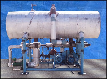 Reco Recirculator Package. Nat'l Bd No. 3804. Approximate capacity: 926 gallons. Recirculator vessel inside straight-wall dimensions: 3 ft. 6 in. dia. x 12 ft. 2 in. L. MAWP: 150 psi @ 300°F. Reco surge tank. Nat'l Bd: 3477. MAWP: 300 psi @ 300°F. Buffalo centrifugal pump. Viking positive displacement pump. Inlets: (1) 6 in. dia. port, (1) 3 in. dia. port. Outlets: (1) 4 in. dia. port, (1) 2-1/2 in. dia. port, (2) 1 in. dia. ports. Overall dimensions: 13 ft. L x 5 ft. 6 in. W x 9 ft. 1 in. H.(H15).