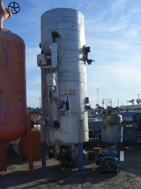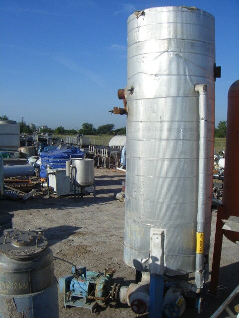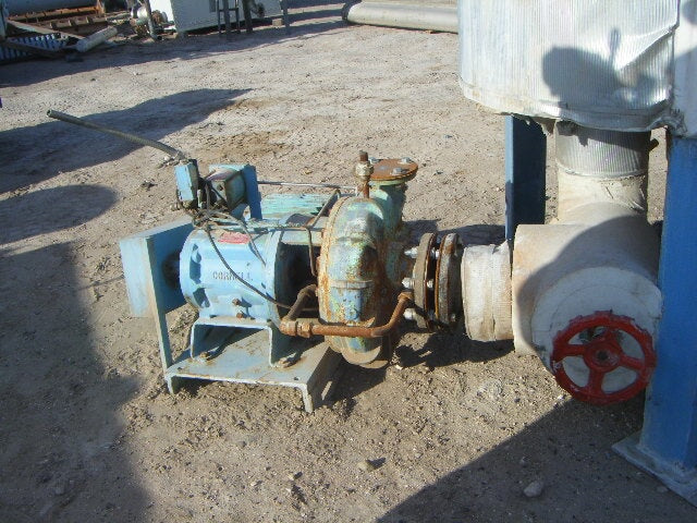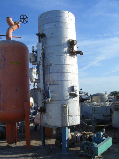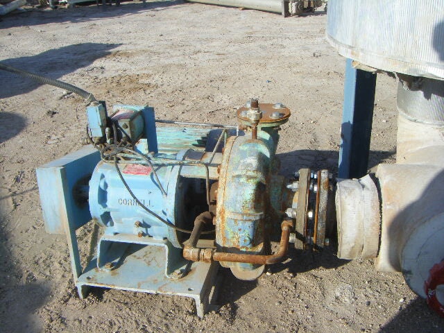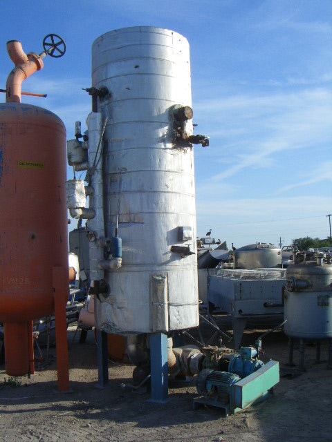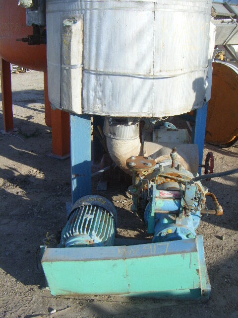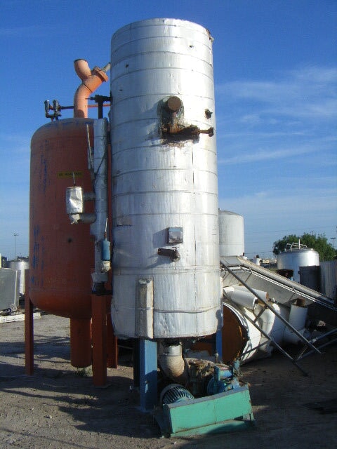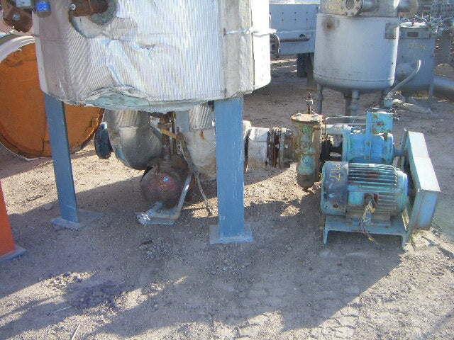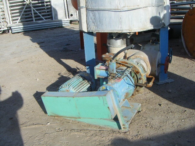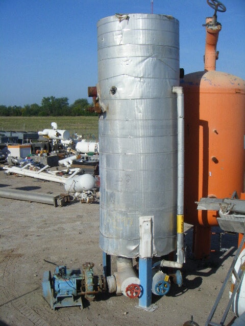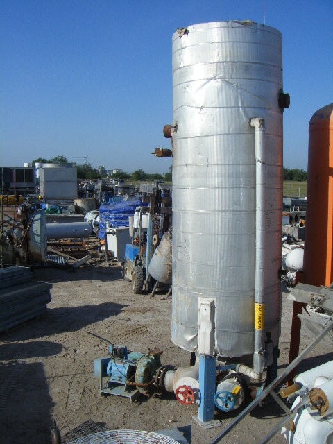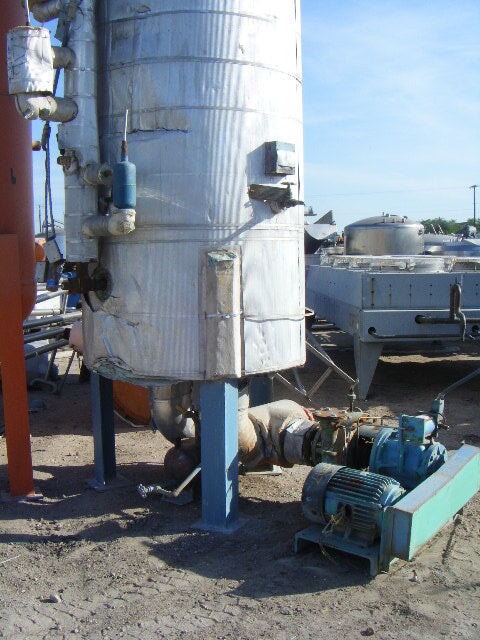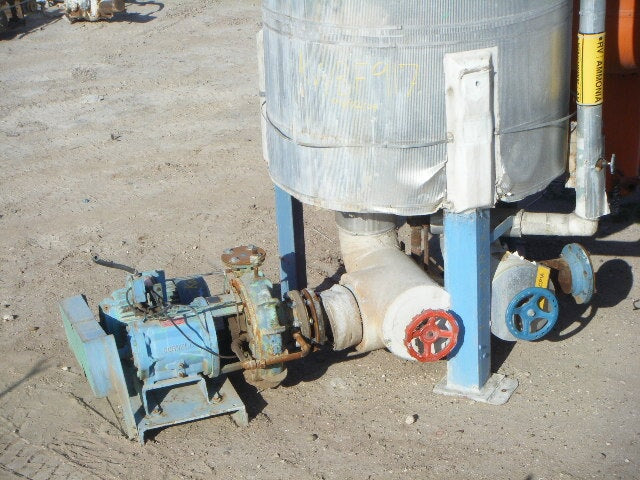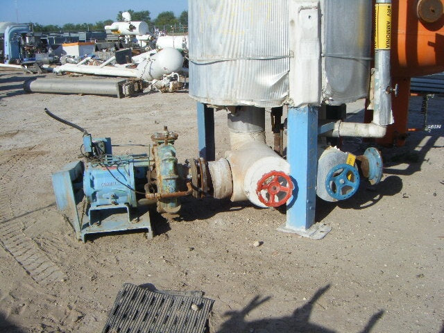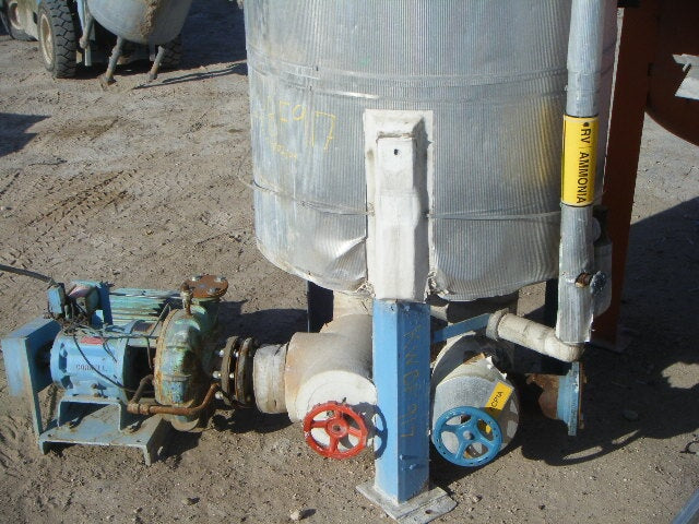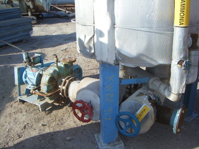 Reco Vertical Ammonia Recirculator Package. Refrigerant: R-717 (Ammonia). Approximate capacity: 1,000 gallons. MAWP: 150 psi at 300ºF. MDMT: -20ºF at 150 PSI. Inside straight wall: 4 ft. dia. x 10 ft. H. Radius: 2:1 elliptical ends. Inlets: (1) 1 in. dia. port, (1) 2 in. dia. port, (1) 6 in. dia. port. Outlets: (3) 6 in. dia. port, (1) 3/4 in. dia. port, (1) 2 in. dia. port. Reco oil pot, MAWP: 300 psi at 300ºF, MDMT: -20ºF at 300 psi. Cornell ammonia pump, Model: 3CB-F16. Flow rate for new pump is 470 gpm with required horsepower and pressure. Impeller diameter: 15.22 in. Inlet: 6 in. suction. Outlet: 3 in. discharge. Overall dimensions: 5 ft. 5in. L x 5 ft. 6 in. W x 15 ft. 3 in. H.