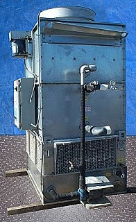 Recold MW-Series Closed Circuit Fluid Cooler- 18 Tons. Model: MWL-18B. Capacity min/max: 25-100 gpm. Coil volume: 42 gal. Airflow: 12,300 cfm. Tube Construction: Copper. Leeson fan motor, 5 hp, 1750 rpm, 208-230/460 V, 13.8-13/6.5 amps, 60 Hz, 3 phase. The MW-series is an induced draft, counter flow design fluid cooler. Recold Centrifugal Pump, impeller diameter: 3.38 in., (2) 1-1/2 in. female npt fittings. Motor, 1 hp, 3500 rpm, 208-230/460v, 60 Hz, 3 phase. Inlets: (1) 3 in. dia. copper tubing (media). Outlets: (1) 3 in. dia. copper tubing (media). Overall dimensions: 5 ft. 2 in. L x 4 ft. 2 in. W x 9 ft. 2 in. H.(ACN205).(BE).