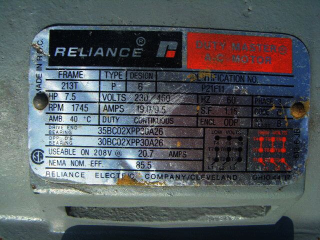 Reliance Electric Motor. Motor specifications: 7-1/2 hp, 3 phase. Frame: 213T. Nema design: B. Type: P. Shaft diameter: 1-1/2 in. Overall dimensions: 1 ft. 1 in. L x 10 in. W x 9 in. H.