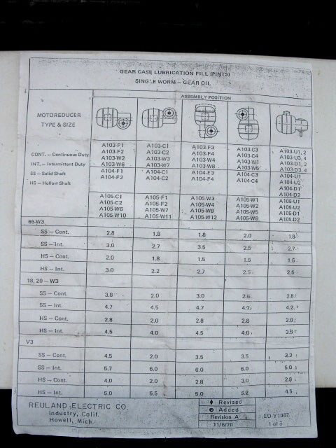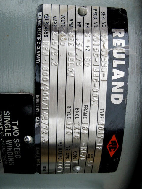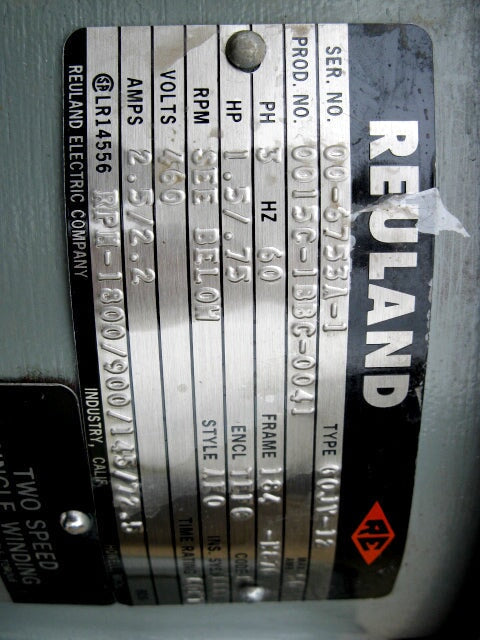 2000 Reuland Electric Company 2-Speed Agitator Drive. Model: GOJV-12. Gear output: 145 / 72-1/2 rpm. Motor: 1-1/2 / ¾ hp, 1800/900 rpm, 60 Hz, 3 phase. Overall dimensions: 2 ft. 1 in. L x 14 in. W x 14 in. H.(ACN83).