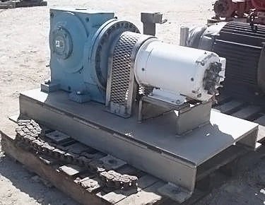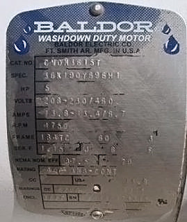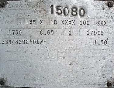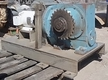 Rexnord Right Angle Drive. S/N: 33448392-01WH. Type: H. Size: 145. Assembly: 1B. Input: 6.65/1750 rpm. Output: 17906 in./lb. Shaft diameter: 2-3/8 in. Sprocket diameter: 10-1/2 in. Number of teeth: 25. Pitch: 1-1/4. Baldor Electric Motor, 5 hp, 1750 rpm, 208-230/460 V, 13.8-13.4/6.7, 60 Hz, 3 phase. Overall dimensions: 3 ft. 7 in. L x 2 ft. 3 in. W x 1 ft. 11 in. H.