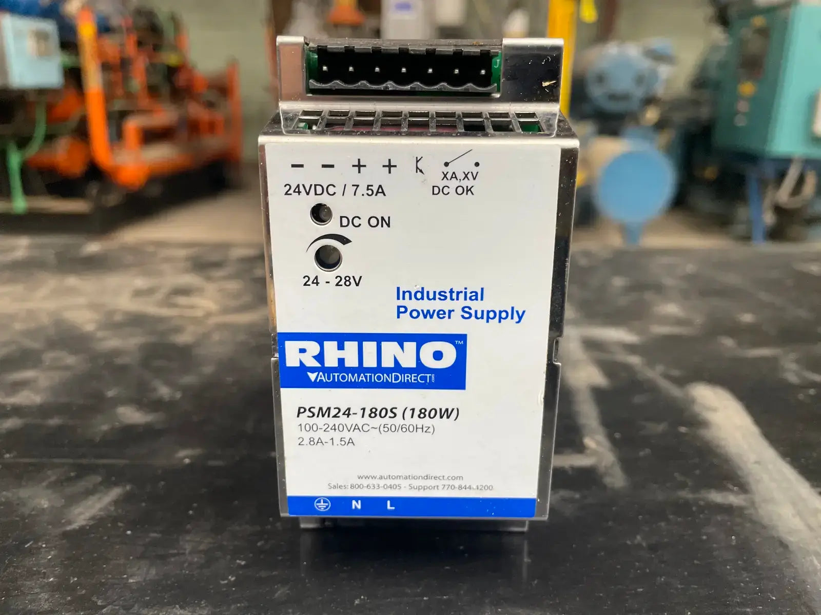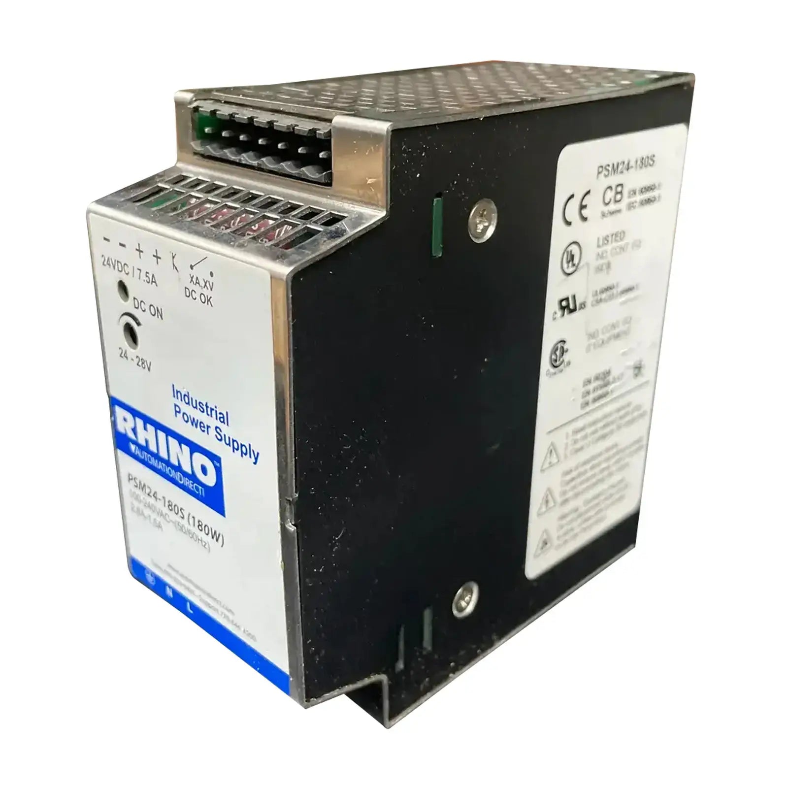 Unused Rhino PSM24-180S industrial DC power supply. Power supply: 100-240 VAC(50/60Hz). 2.8A-1.5A.