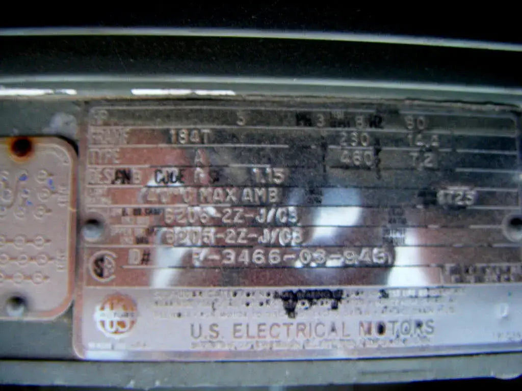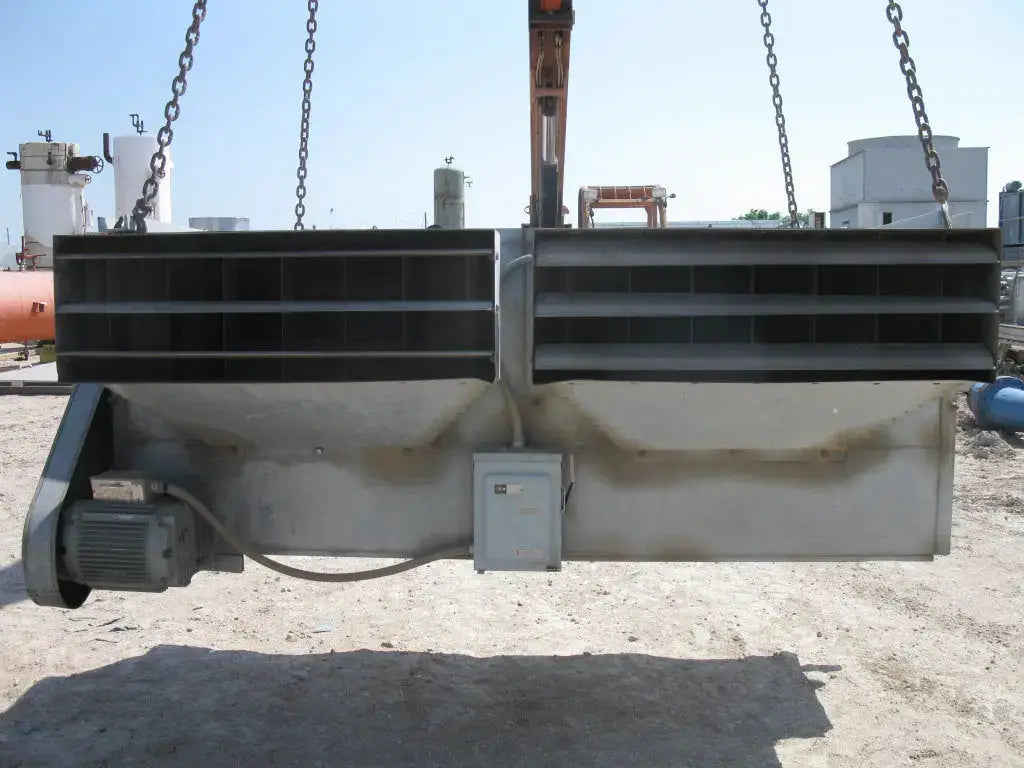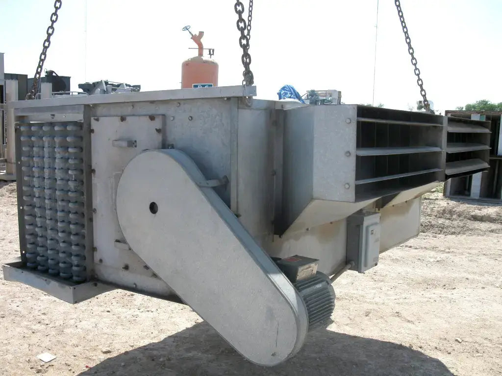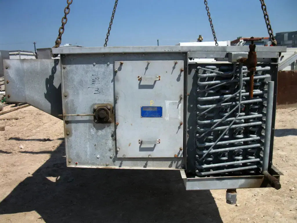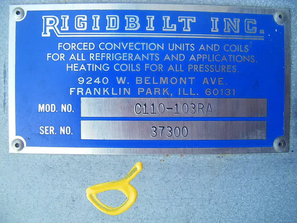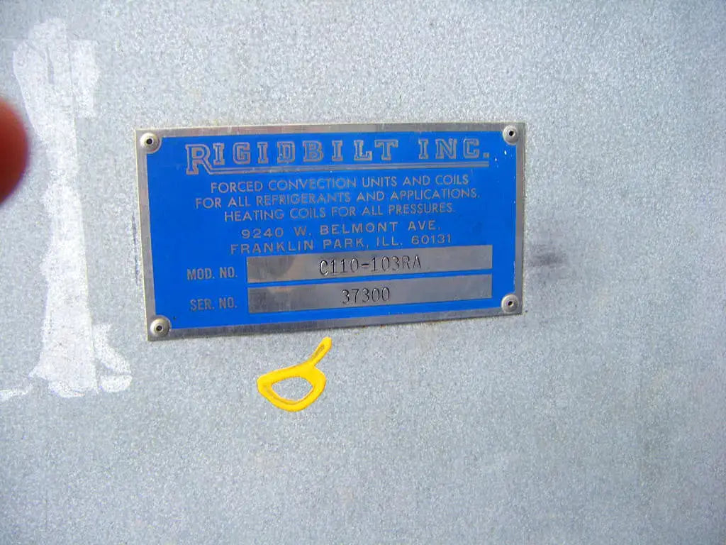 Rigidbilt Inc. Hanging Evaporator. Model: C110-103RA. Estimated nominal capacity: 8.5 tons or 11,000 BTUH using direct expansion ammonia (R-717) for a 40°F room with a suction temperature of 30°F. Coil: 10 rows of a ¾ in. diameter tube with 3 fins per inch. (2) squirrel cage design fans, 2 ft. 1 in. diameter, each with 48 blades. Pulley diameters: (1) 7-1/2 in. driver. (1) 1 ft. 1-3/4 in. driven. U.S. Electrical motor: 5 hp, 1725 rpm, 230/460 V, 14.4/7.2 A, 60 Hz, 3 phase. Cutler-Hammer on/off power box: 20 max hp, 600V, 30A, 3 phase. Front air inlet dimensions: 3 ft. L x 1 ft. W. Inlets/outlets: (1) 2-1/2 in. NPT, (1) 2 in. NPT, (1) ¾ in. NPT. Front air vent dimensions: 3 ft. L x 1 ft. W. Overall dimensions: 8 ft. 6-1/2 in. L x 3 ft. 7-1/2 in. W x 6 ft. 5-1/4 in. H.(ACN145).