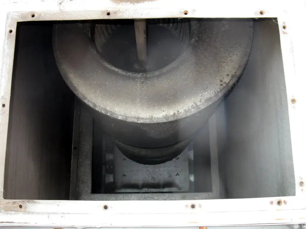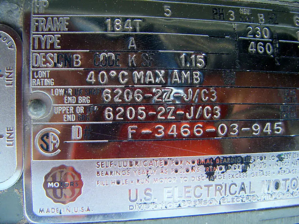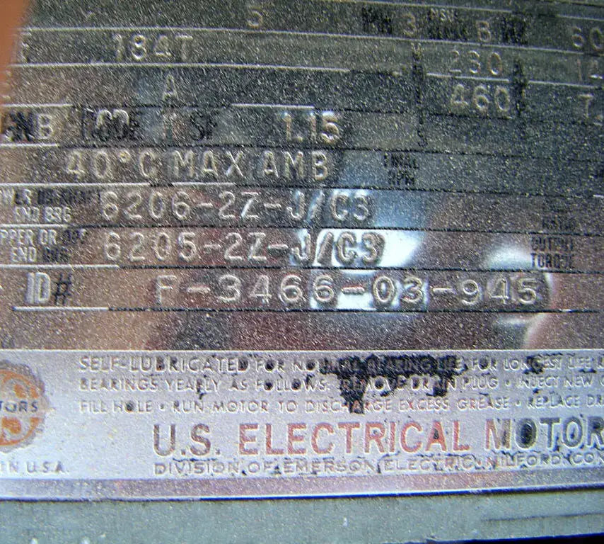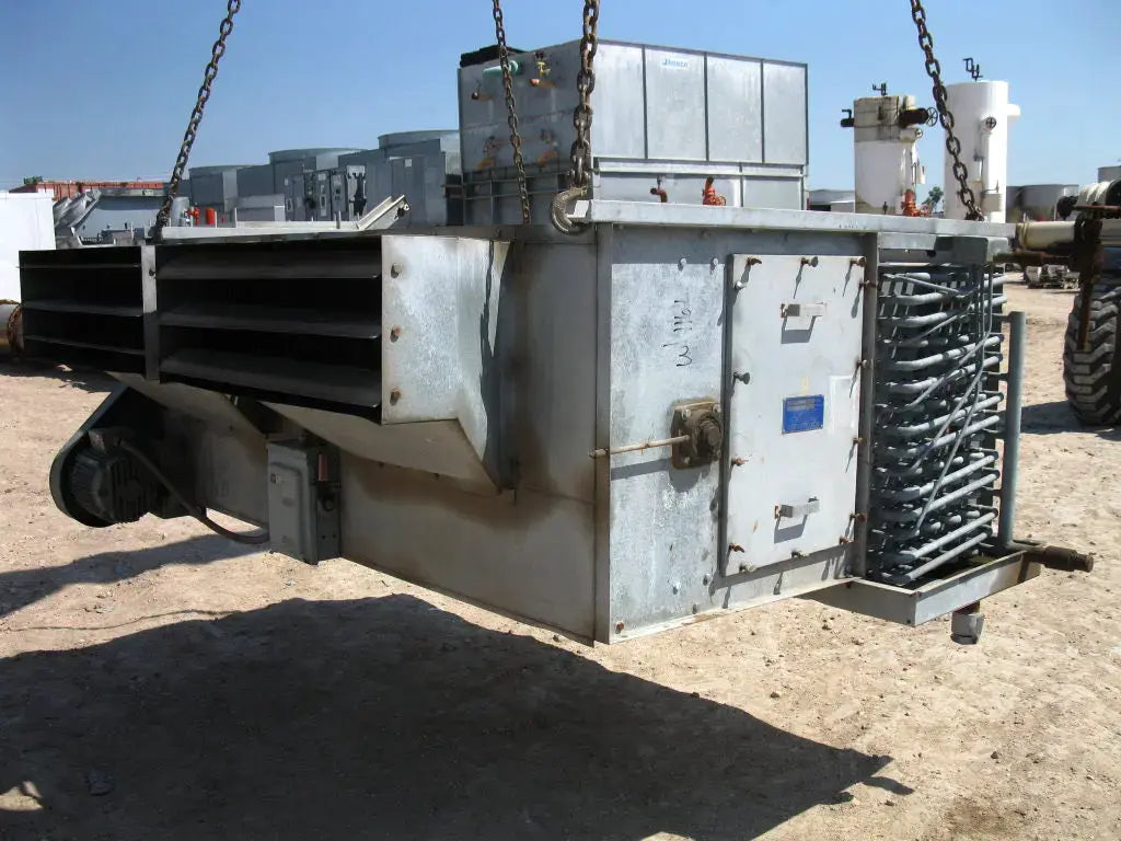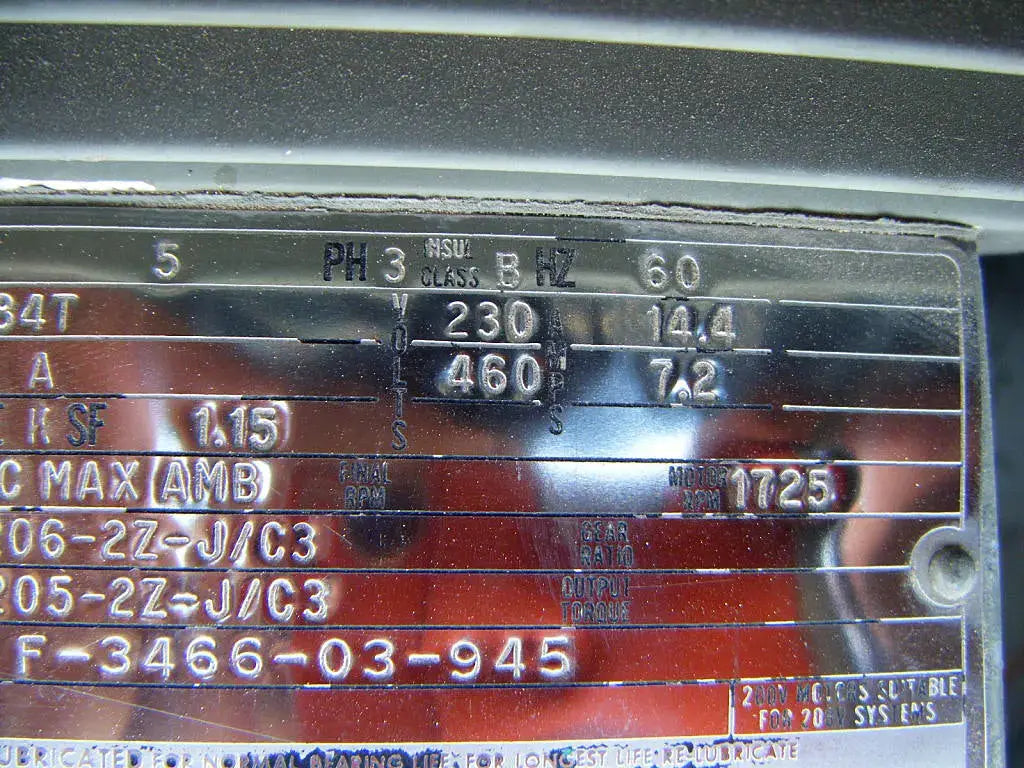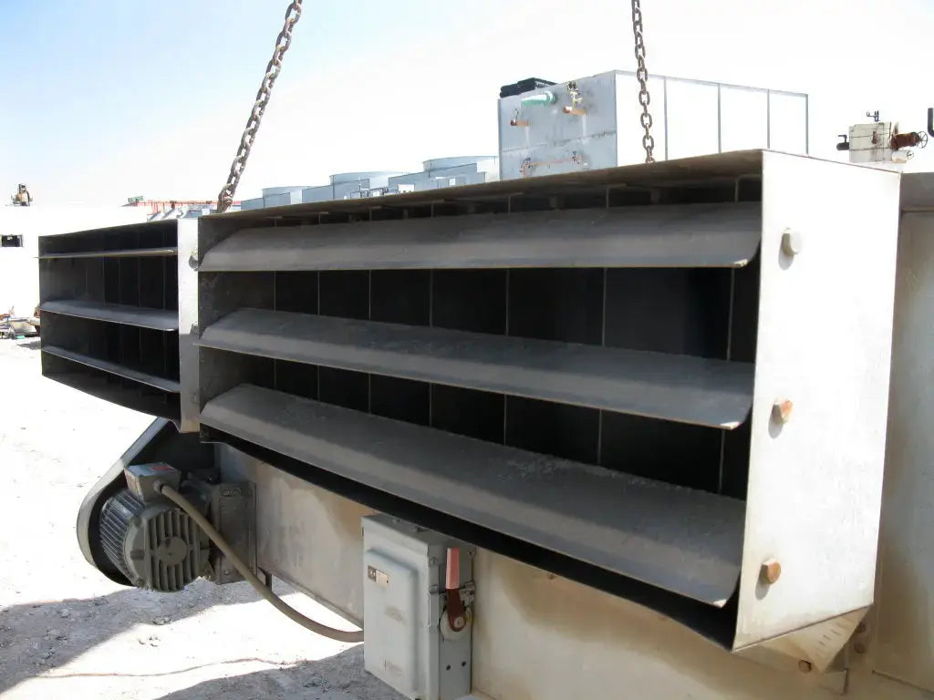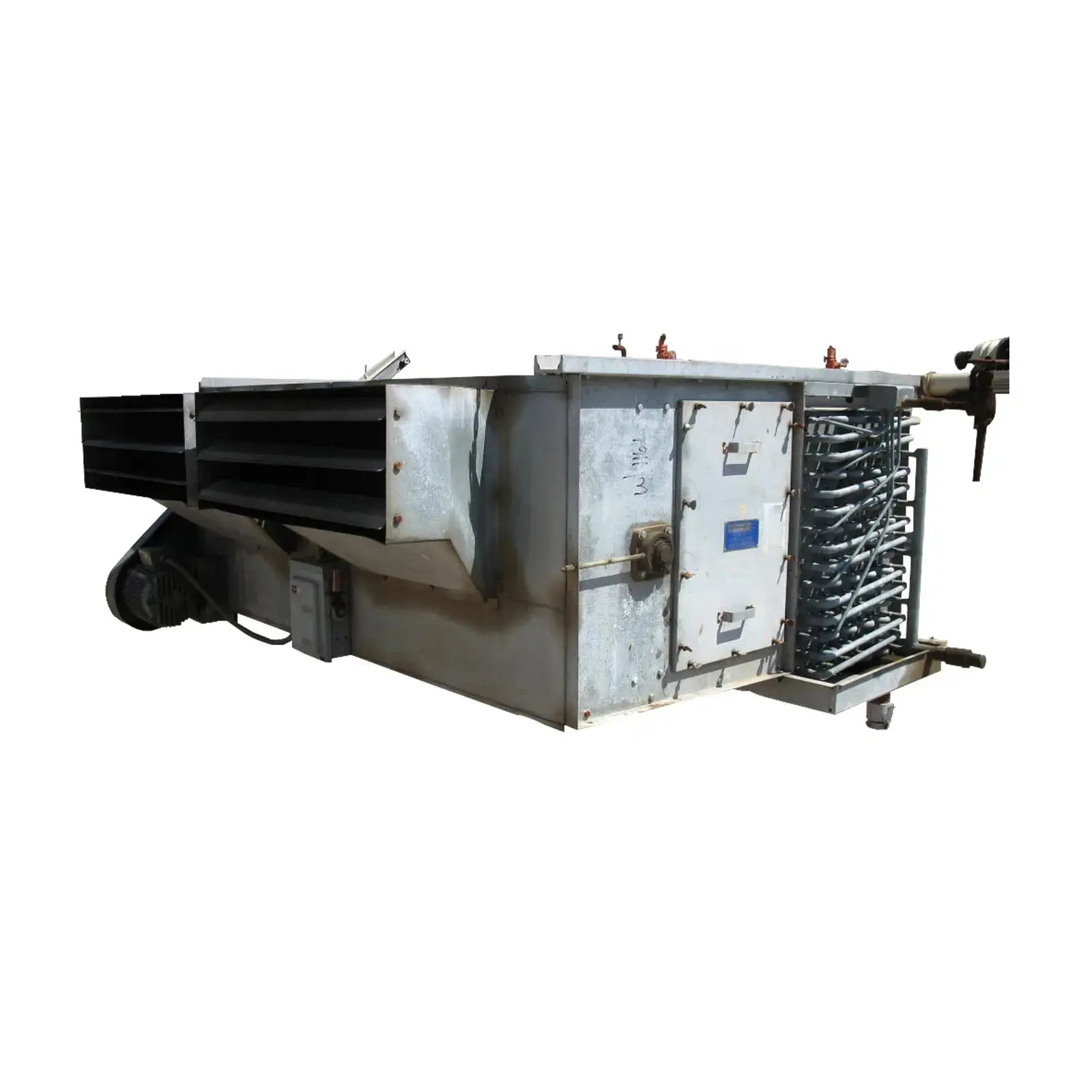 Rigidbilt Inc. Hanging Evaporator. Model: C110-103RA. Estimated nominal capacity: 8.5 tons or 11,000 BTUH using direct expansion ammonia (R-717) for a 40°F room with a suction temperature of 30°F. Coil: 10 rows of a ¾ in. diameter tube with 3 fins per inch. (2) squirrel cage design fans, 2 ft. 1 in. diameter, each with 48 blades. Pulley diameters: (1) 7-1/2 in. driver. (1) 1 ft. 1-3/4 in. driven. U.S. Electrical motor: 5 hp, 1725 rpm, 230/460 V, 14.4/7.2 A, 60 Hz, 3 phase. Cutler-Hammer on/off power box: 20 max hp, 600V, 30A, 3 phase. Front air inlet dimensions: 3 ft. L x 1 ft. W. Inlets/outlets: (1) 2-1/2 in. NPT, (1) 2 in. NPT, (1) ¾ in. NPT. Front air vent dimensions: 3 ft. L x 1 ft. W. Overall dimensions: 8 ft. 6-1/2 in. L x 3 ft. 7-1/2 in. W x 6 ft. 5-1/4 in. H.(ACN145).